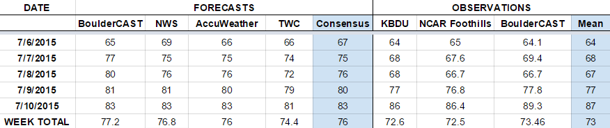 Tuesday and Wednesday were particularly troublesome for meteorologists. After having the best forecast for Monday, BoulderCAST had the worst forecast for Tuesday, Wednesday, and Thursday. We did finish the week on top, tying for the closest forecast on Friday. Once we get through enough weeks, we’ll compile some data for your viewing pleasure! Stay tuned!