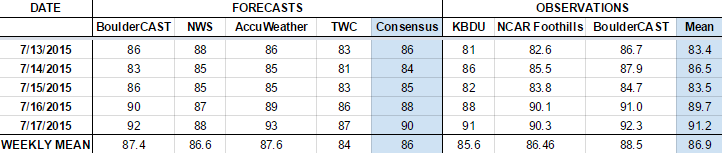 The bottom row of the error table shows the weekly mean error for each weather outlet, a good measure for who was the best and more consistent “forecaster” for the week. BoulderCAST came in second place, just behind AccuWeather, with an average of 1.9 degrees error through the week. After doing the best last time, The Weather Channel performed the poorest this week (a.k.a. the norm).