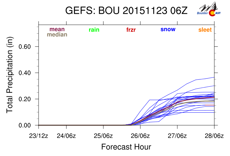 It looks like a widespread light snow event, with most of Wyoming, eastern Colorado and NE New Mexico getting in on the action. Right now, the best snow looks to set up in central Wyoming, but there is still plenty of time for things to evolve. We are fairly confident that everyone will have a white Thanksgiving across Boulder County! The snow, combined with cold temperatures, will likely produce some slick roads across the region, particularly Thursday evening and night. Not the best timing, but do be careful if you are traveling to meet up with family and friends.