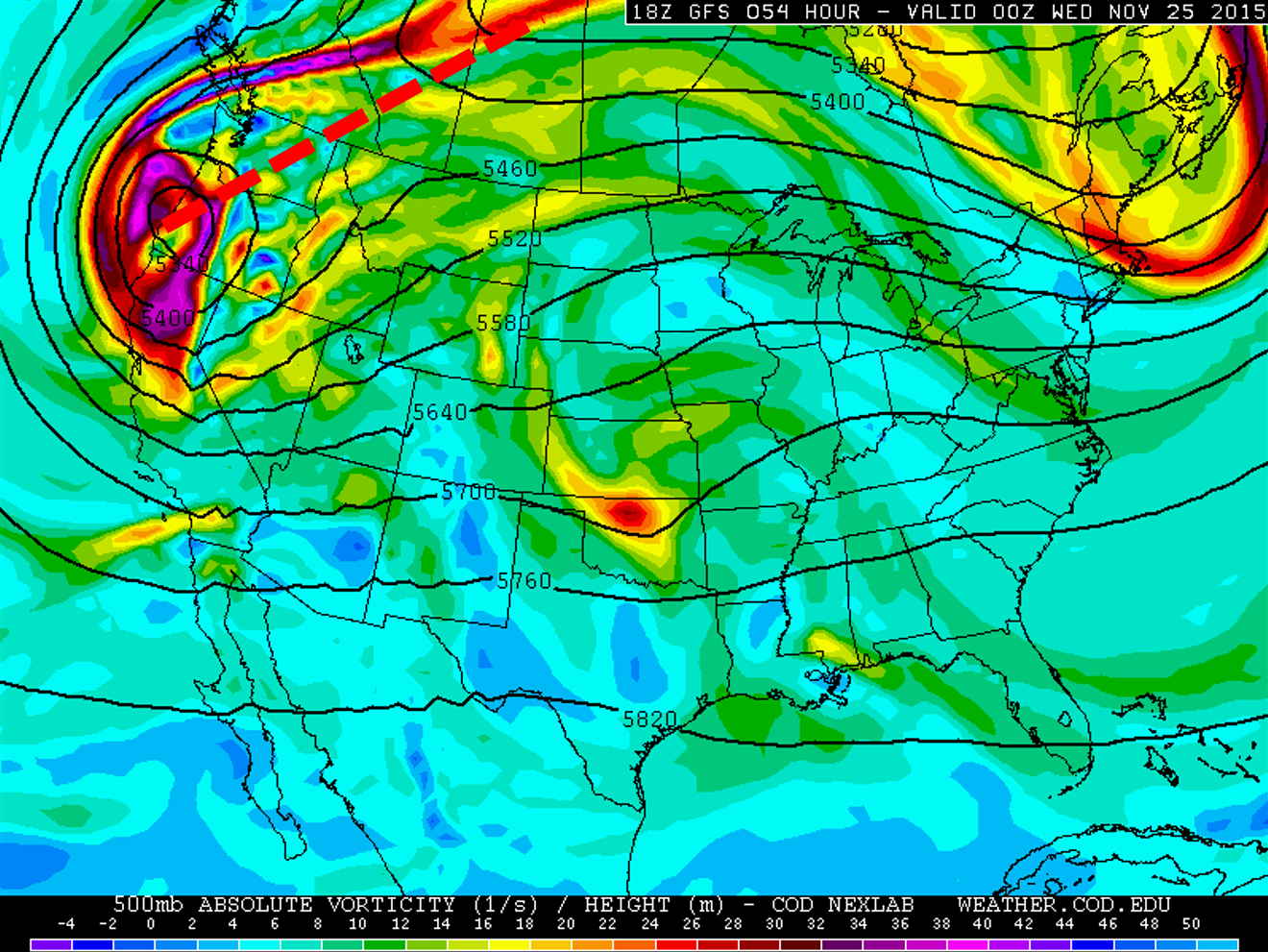 By Tuesday afternoon, we can see this week’s main weather system now ashore in the Pacific Northwest. The trough already has a significant positive tilt (axis looks like a forward slash), which is outlined in a dashed red line below. This generally indicates a weak or weakening system.