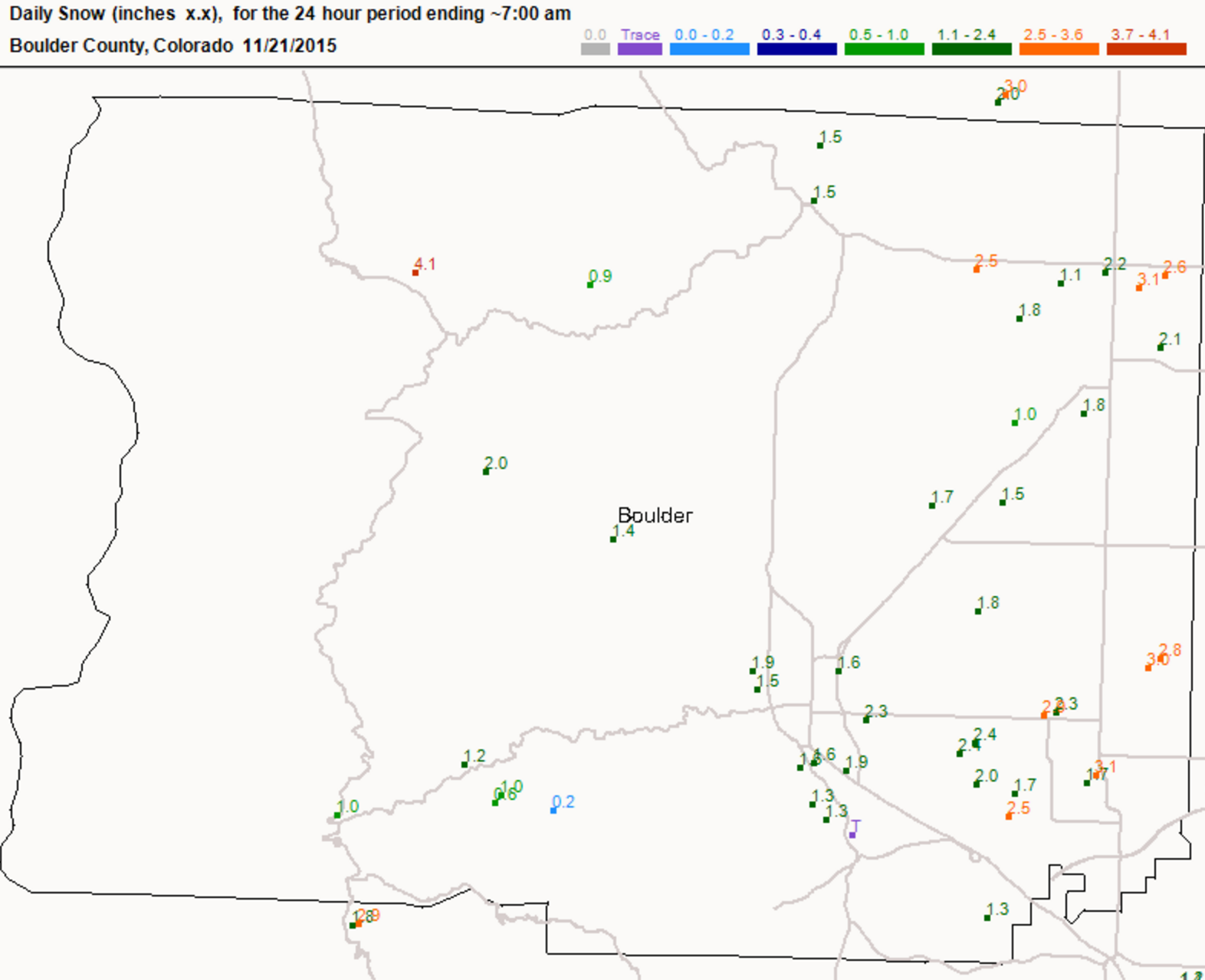 Despite the forecasting woes of last week’s storm, everyone across the Front Range should have gotten at least a little taste of snow on Friday night, with a general 1-3″ falling across most of Boulder County as a weak front moved through (see map below). This time there was plenty of cold air.