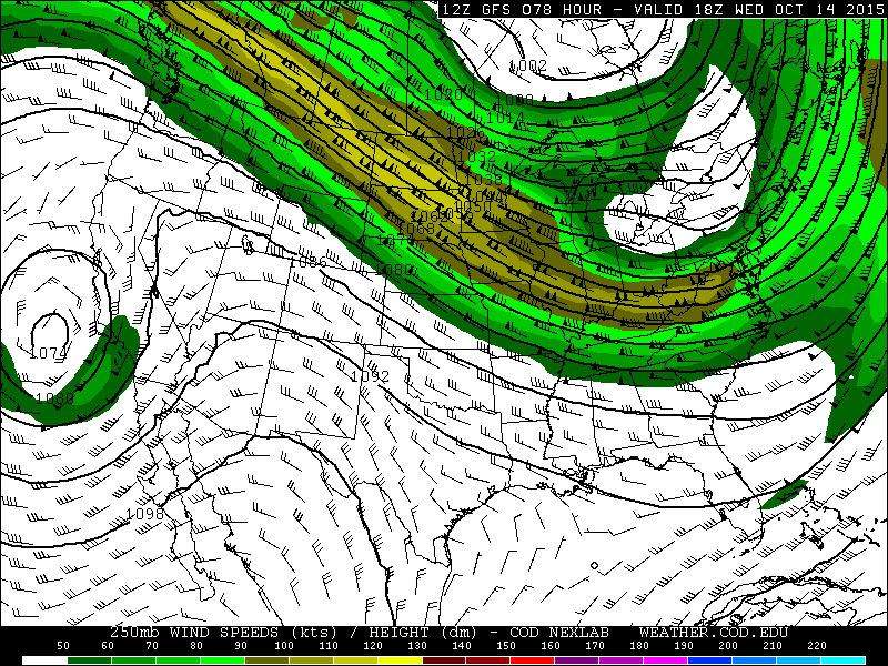 Below shows the upper-level 250 mb winds at jet level and the height pattern. The trough in the eastern United States is quite evident in this image, with the jet stream just to the northeast of Colorado in the upper Midwest.