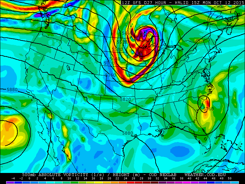 For today, expect high temperatures some 10 degrees cooler than Sunday in the mid 70’s with upper 60’s in the Foothills of Boulder County with full sunshine. Below shows the 500 mb height pattern and absolute vorticity for Monday across the U.S. The aforementioned cold front yesterday was tied to a deep low pressure system now over Minnesota. Although not impacting us this week, off the coast of California is a cut-off low pressure system. This low actually impacted us on October 5th and 6th, and has since retrograded westward. It is possible this system could move northward by the weekend and possibly introduce precipitation to southwestern Colorado late Friday and Saturday. Don’t stress yet as there is a lot of uncertainty with the system that far out.