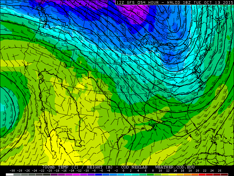 On Tuesday and Wednesday, a large trough of lower pressure will be anchored across the eastern United States, as evident in the below 700 mb temperature and height pattern from the GFS model. In the western United States, where we live, you can see a general ridge of high pressure. However, this ridge will be centered more to our west over Arizona Tuesday and Wednesday, and hence, temperatures will be warmer but not as warm as we saw this past weekend (thanks to the trough to the north keeping the ridge at bay!). Expect highs in the low 80’s on Tuesday.