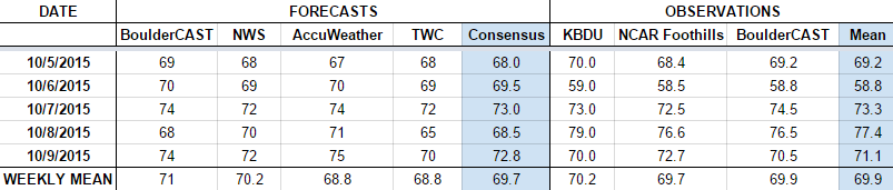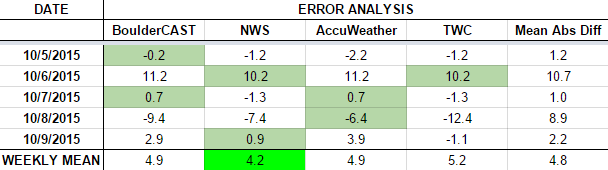 The bottom row of the error table shows the weekly mean error for each weather outlet, a good measure for who was the best and more consistent “forecaster” for the week. First place this period goes to the NWS, with a rather large 4.2 degrees of error averaged across the period. BoulderCAST came in second place, with 4.9 degrees of error, having the best forecast on Monday and Wednesday. Overall, this was by far the worst forecasting week for everyone. Hopefully we can nail down the forecast for the week ahead a little better!