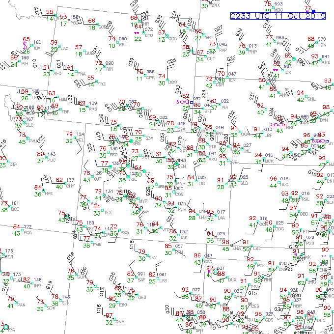 Below shows the surface weather observations over Colorado yesterday. Highs were in the mid 80’s across the Front Range, with some locations in far northeast Colorado in the low to middle 90’s. These warm temperatures combined with the strong winds from the west-northwest to produce high fire danger in some areas. Two small brush fires ignited in the warning area east and north of Denver, one charring at least 100 acres. We have warned in the past that only a little bit of wind would produce fire weather conditions.