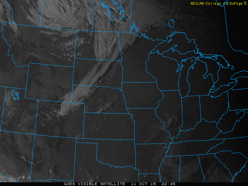 Below shows the visible satellite image from yesterday late in the afternoon. Colorado is located in the left part of the image. Notice the large band of clouds stretching from northeastern Colorado, up north into the Dakotas. This was the frontal system discussed earlier which will is responsible for today’s cool down. Sometimes you can pick up the front relatively easily due to clouds ahead of the system. However, that is not always the case in Colorado, where shallow, slow-moving, moisture-starved fronts are commonplace.