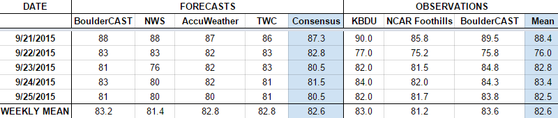 Most days this week were forecast exceptionally well by most outlets, except the NWS. The day with the largest error was Tuesday. Cloud cover from Tropical Depression 16-E was more extensive then expected, stretching northward all the way into Wyoming. This kept highs cooler than forecast (76 degrees, instead of the forecasted 83).