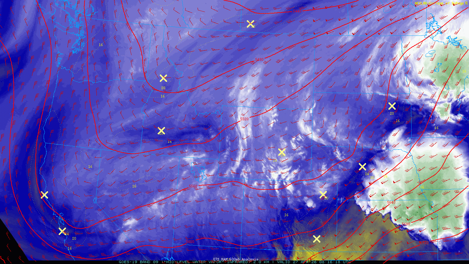 GOES-East water vapor animation from Monday morning, with overlaid 500mb height and wind. It’s a very troughy West right now!