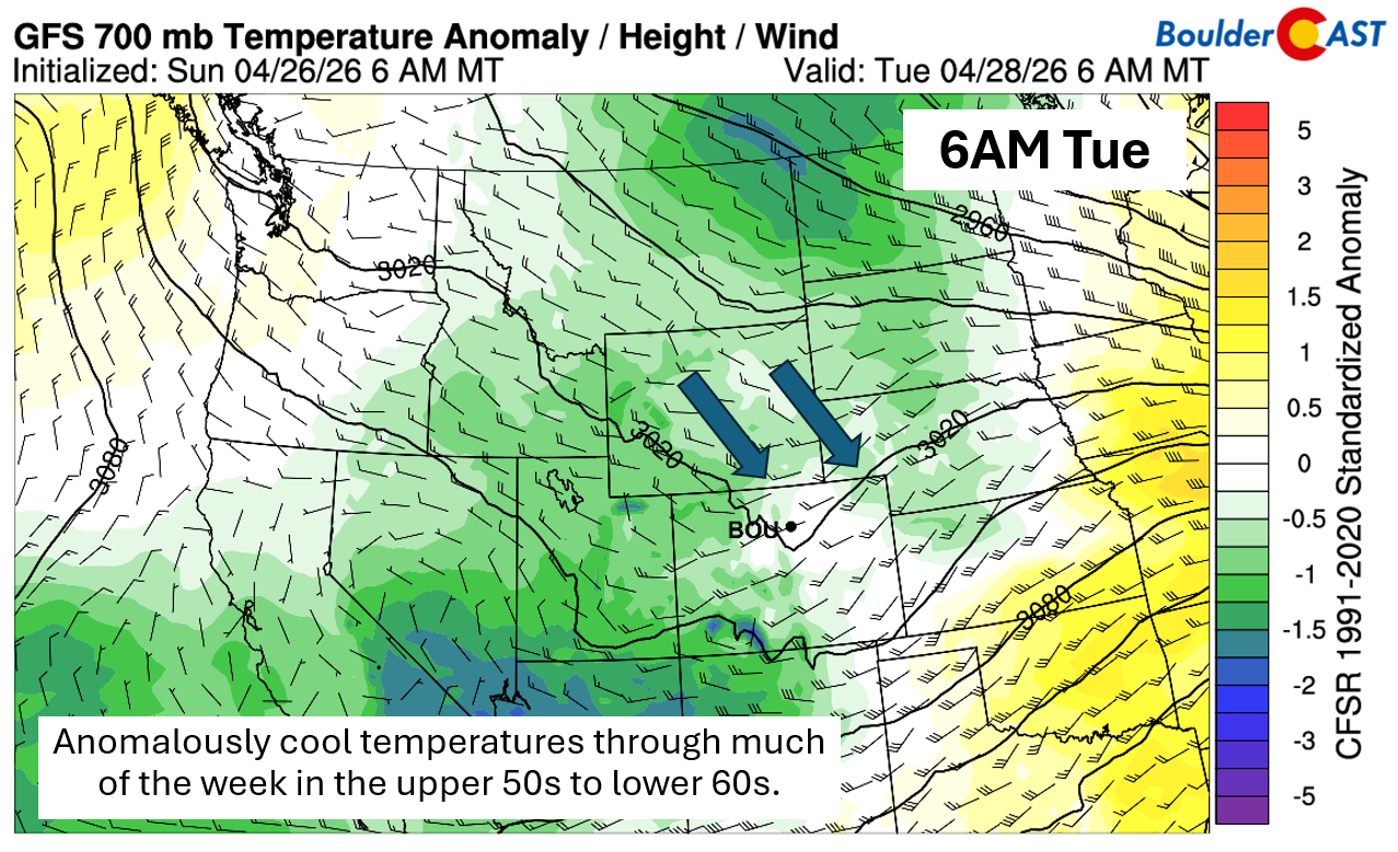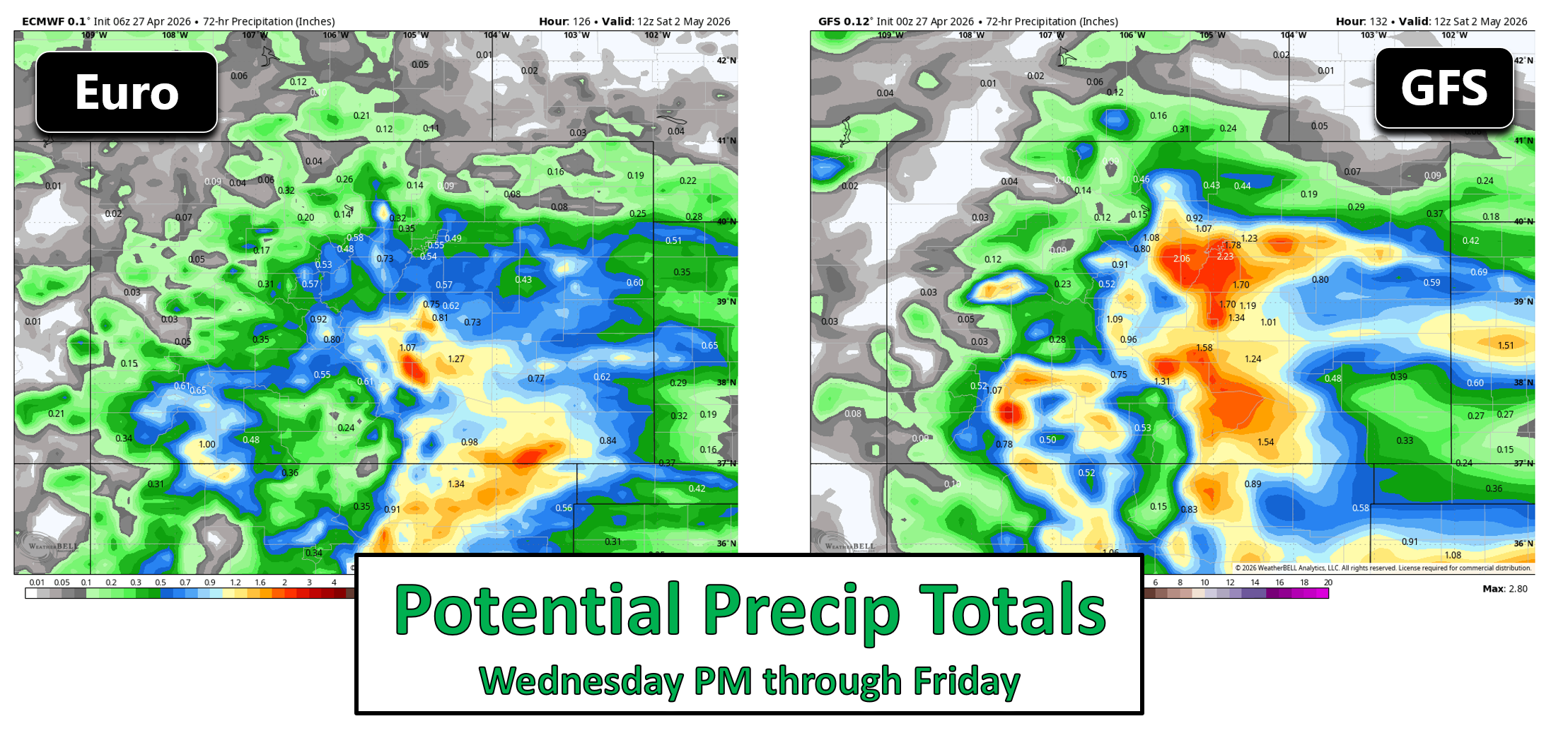 By week’s end, most Front Range locations should exceed a half inch of total rainfall, with the Foothills, Palmer Divide, and southeast Colorado favored for 1 inch or more.