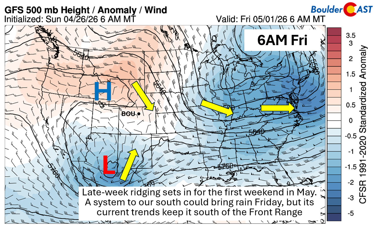 As we head into the weekend, ensemble signals strengthen for weak ridging over Idaho and Wyoming to build southeastward, promoting drying and a warming trend to kick off May. Highs should rebound into the mid‑60s to low‑70s. Rain chances aren’t zero on Friday — especially if the southern‑track system nudges farther north — but current trends keep most of the moisture south of Denver on Friday.