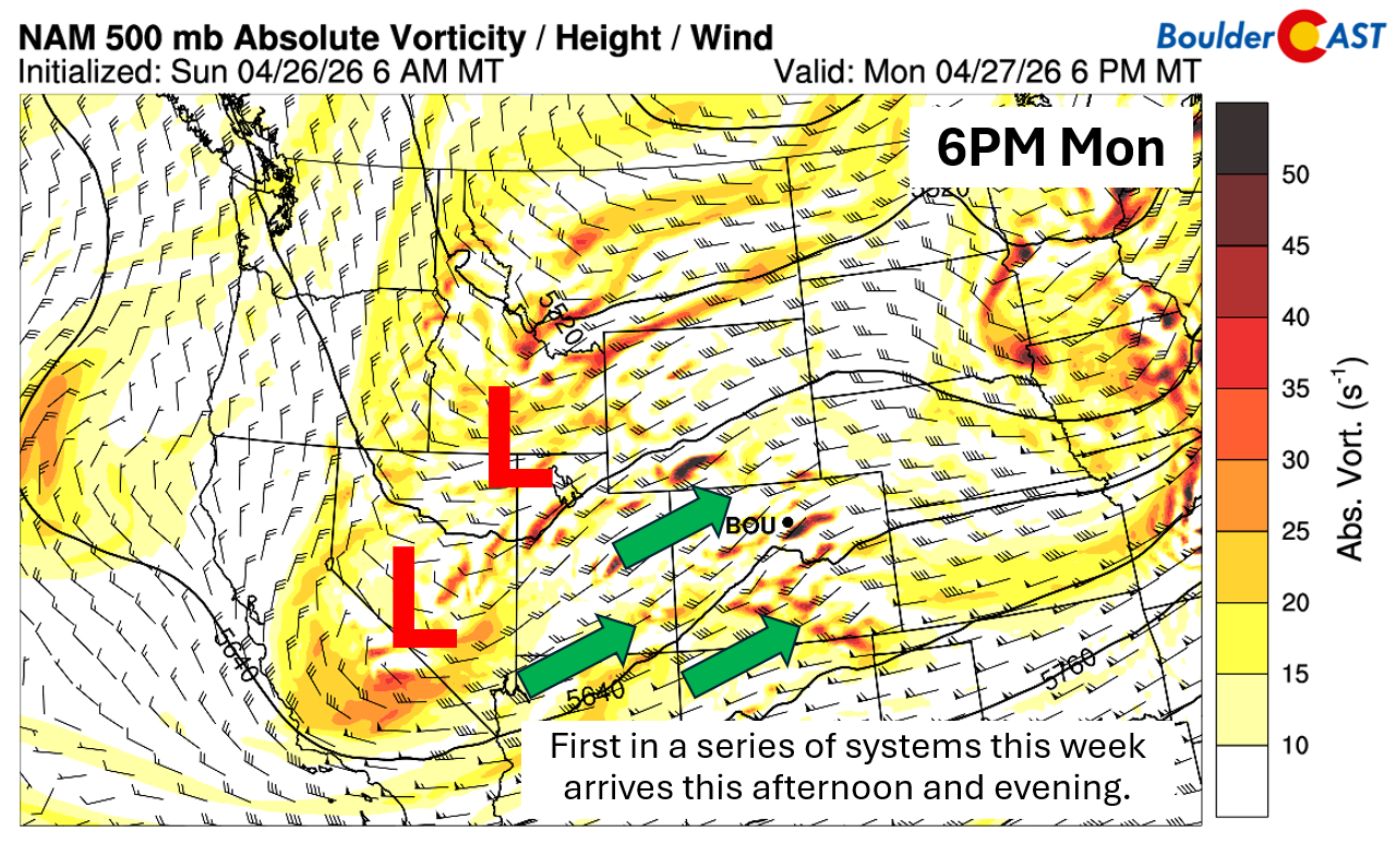 The first in this parade of disturbances arrives Monday afternoon and evening. A pair of loosely connected lows — one over southern Idaho and another over Nevada — will funnel moisture and mid‑level energy into Colorado. As these features shift eastward into Utah and Wyoming on Tuesday, another round of showers is expected Tuesday afternoon and evening.