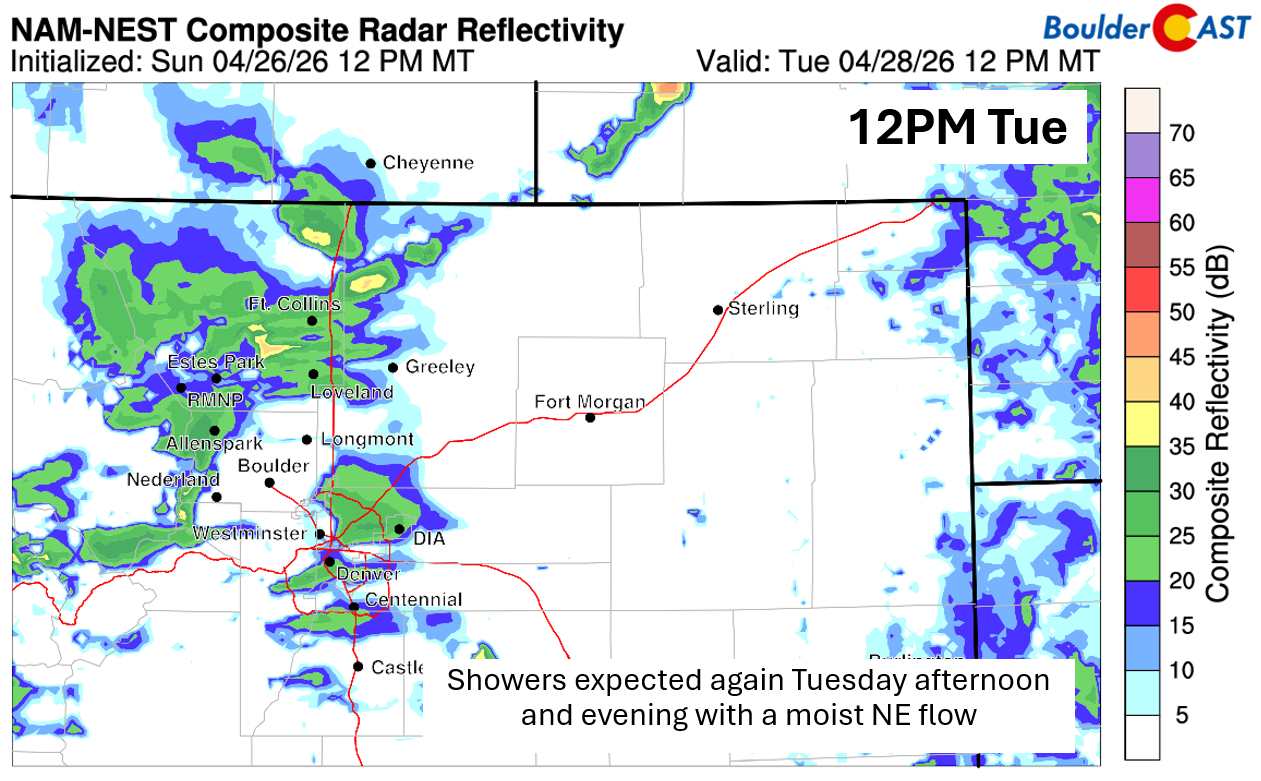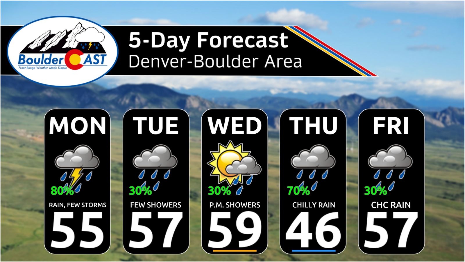 Monday and Tuesday: Mostly cloudy with afternoon and evening showers. A few embedded storms are possible. Highs in the mid to upper 50s on the Plains and mid 40s in the Foothills.
