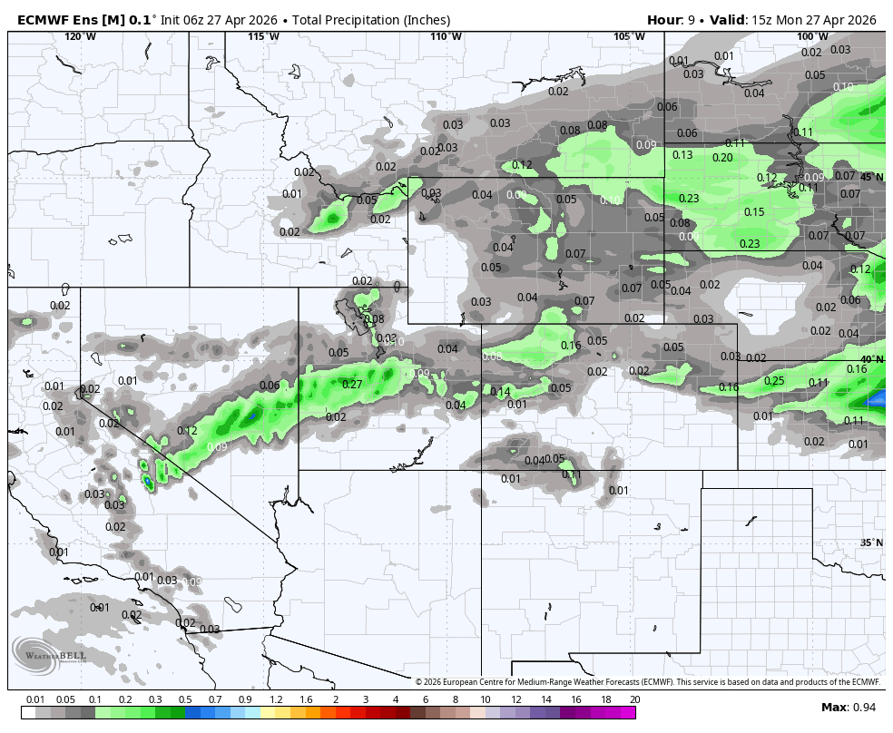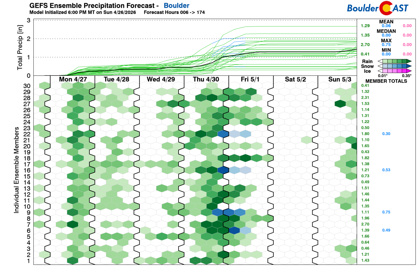 The final stretch of April is poised to finish on a decidedly wetter note. The old saying “April showers bring May flowers” may actually come true this year. After a notably dry spring, the late‑month pattern is at least giving us some atmospheric “bang for our buck.” GEFS ensemble guidance highlights several windows for precipitation across the Boulder area this week. Not every day will be a washout, but the overall theme is clear: cool, cloudy, and frequently damp along the Front Range. By the weekend, a shift toward somewhat drier and warmer conditions appears increasingly likely.