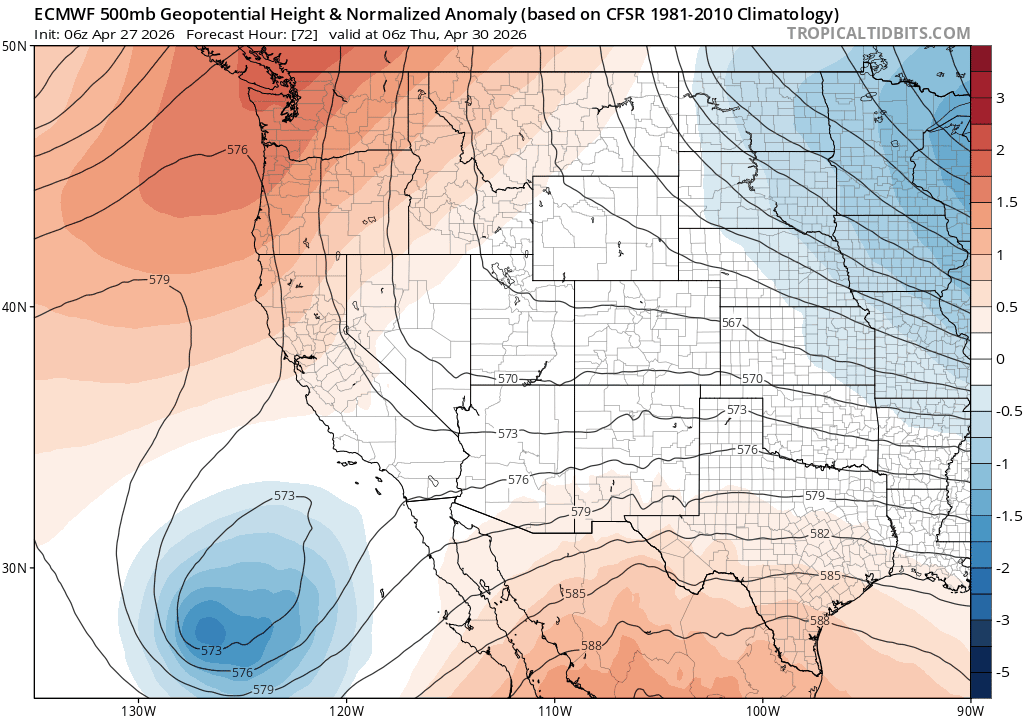 Euro 500mb height anomaly forecast animation for late-week showing the two storm systems which may/may not phase across the Four Corners area.