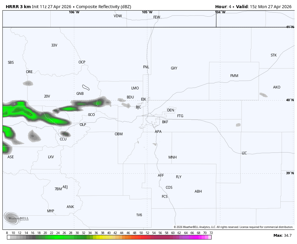 HRRR model simulated radar animation for Monday showing the numerous showers and thunderstorms expected across the Front Range