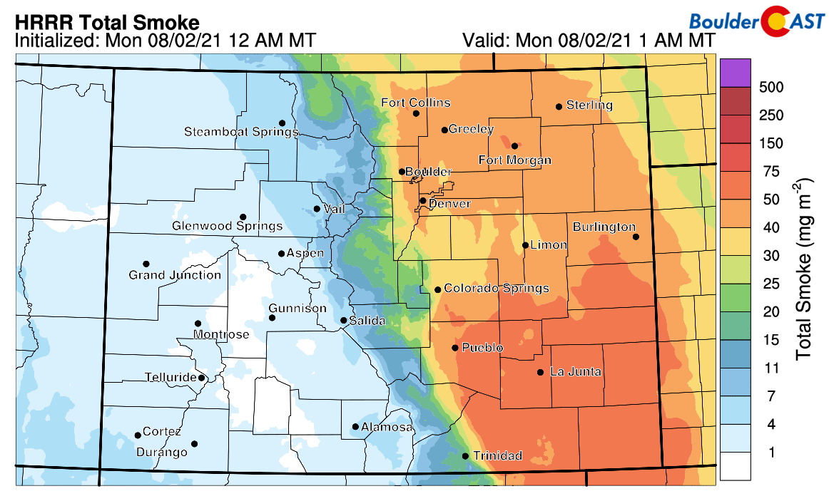 Thick smoke remains entrenched across the Denver Metro area as of early Monday. This is the view looking east from Pikes Peak this morning. A thick layer of smoke is blanketing the Plains, with minimal smoke aloft.