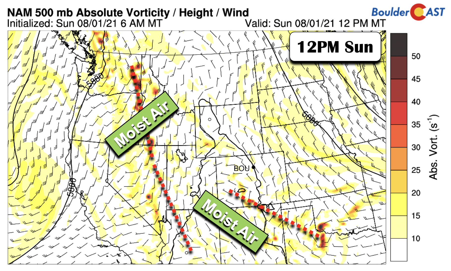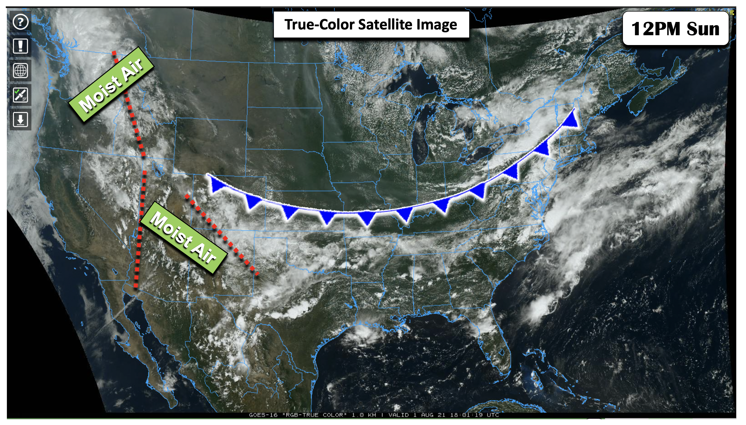 The figure below highlights a true-color satellite image as of 12 PM Sunday (yesterday afternoon) across the Nation. A cold front was located over the Midwest into the northeastern U.S. Drier weather was present over the Front Range yesterday, but monsoon moisture was not far away. The moisture axis yesterday was over two regions: (1) over southwest Colorado into northern New Mexico, and (2) a region oriented north-south from Idaho into western Arizona. This moisture plume will slowly make its way east today and tomorrow, increasing our rain chances through Tuesday.