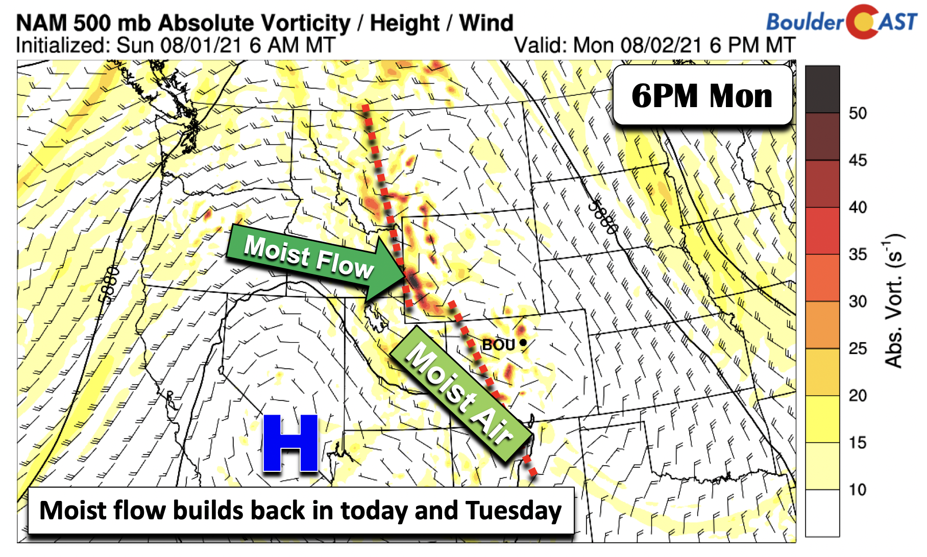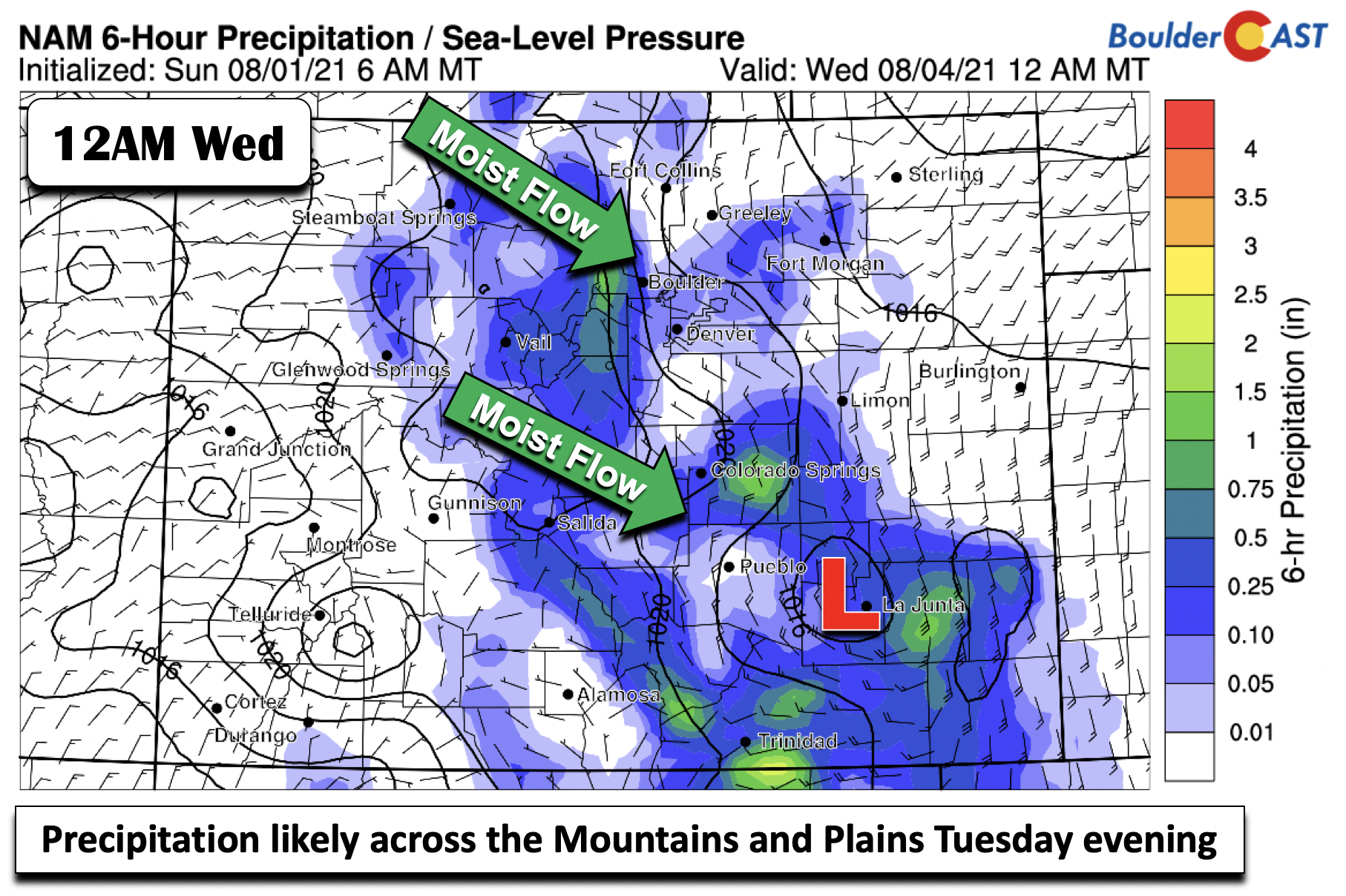 - Monsoon moisture increases Monday across the High Country and Tuesday over the Plains