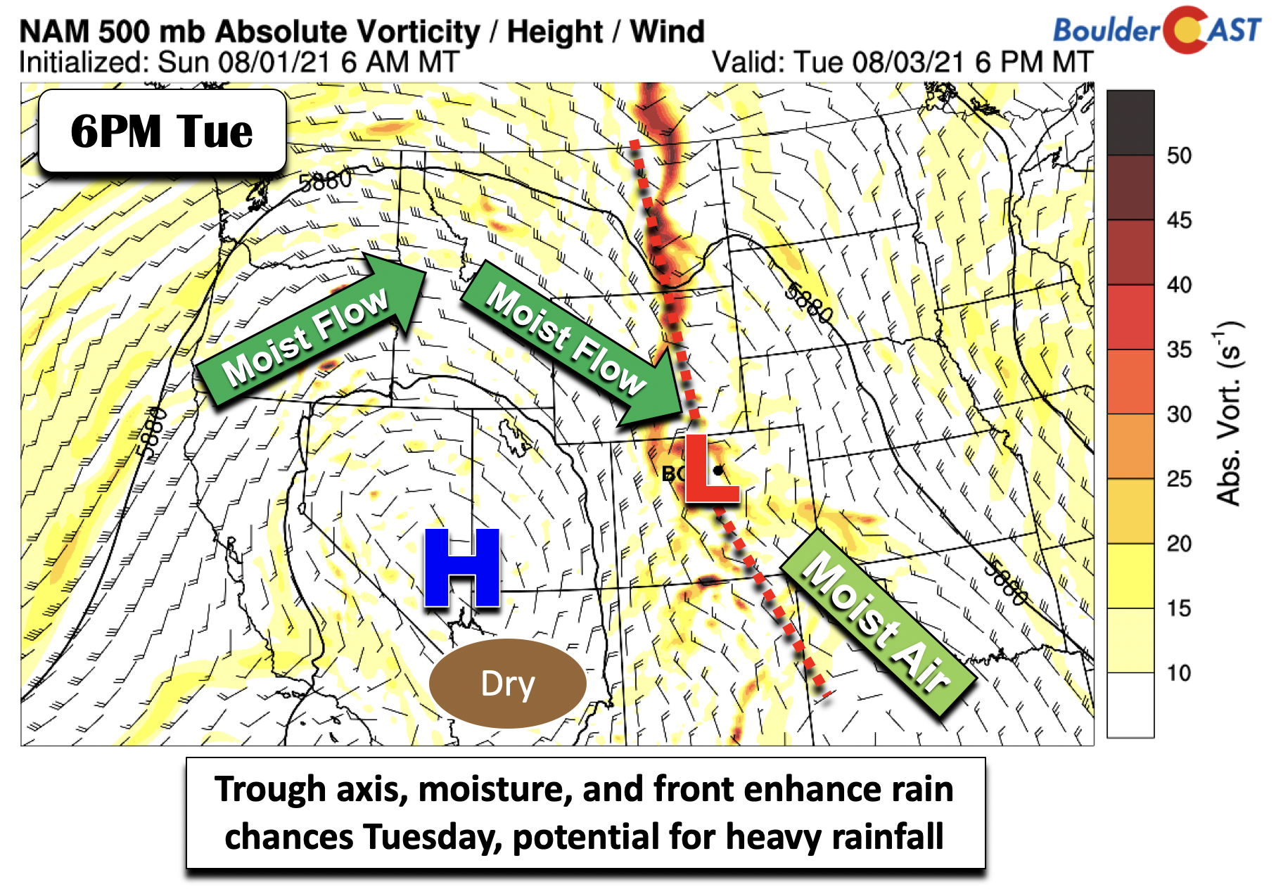 By Tuesday evening, the aforementioned trough axis and moist flow will largely intersect the central part of the state, and be located near the boundary of the Foothills and Plains (below). The moist flow will focus along and west of the Foothills. A weak area of low pressure is also forecasted by the guidance to aid lift for the Plains, though we have some doubts. As a result of increased moisture tomorrow, clouds will limit our daytime highs to the lower 80’s.