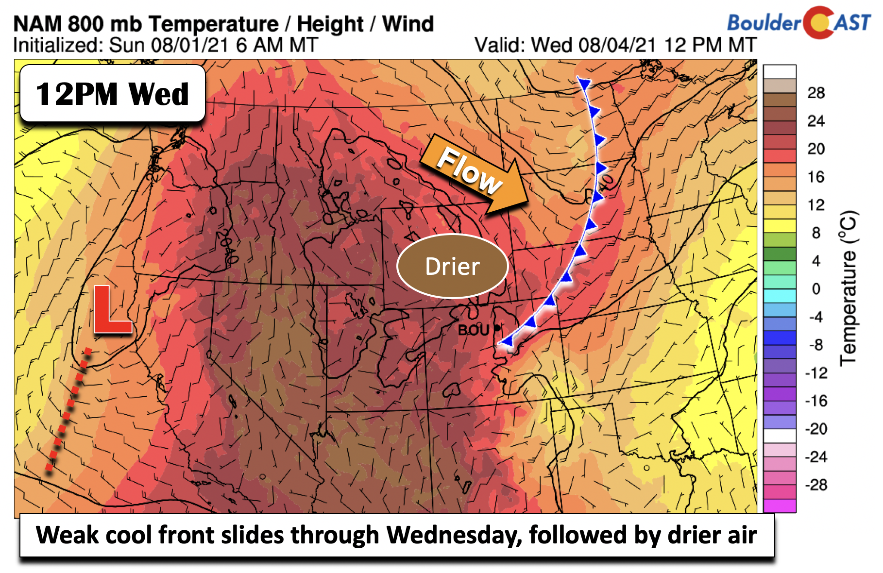 On Wednesday, a weak cool front will slide through, as the trough axis and moisture boundary pushes south into southeastern Colorado. Drier air and northeast flow will ensue over the Front Range. Although the airmass behind the front is not particularly that much cooler, highs should remain near the lower 80’s, similar to Tuesday. There is a slight chance of an afternoon storm, given the weak upslope and some lingering moisture, but most areas should be dry.