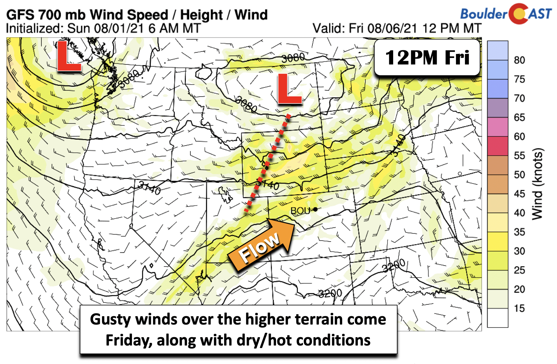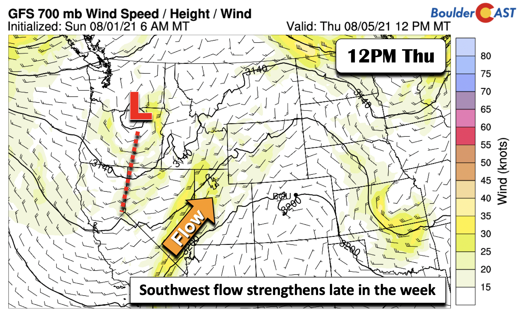 On Thursday, a trough of low pressure offshore from California Wednesday will be tracking east-northeast into Oregon and eventually Montana by week’s end. As the eastern part of this system encroaches closer to Colorado, southwest flow should start to dominate, particularly late Thursday and much of the day on Friday.