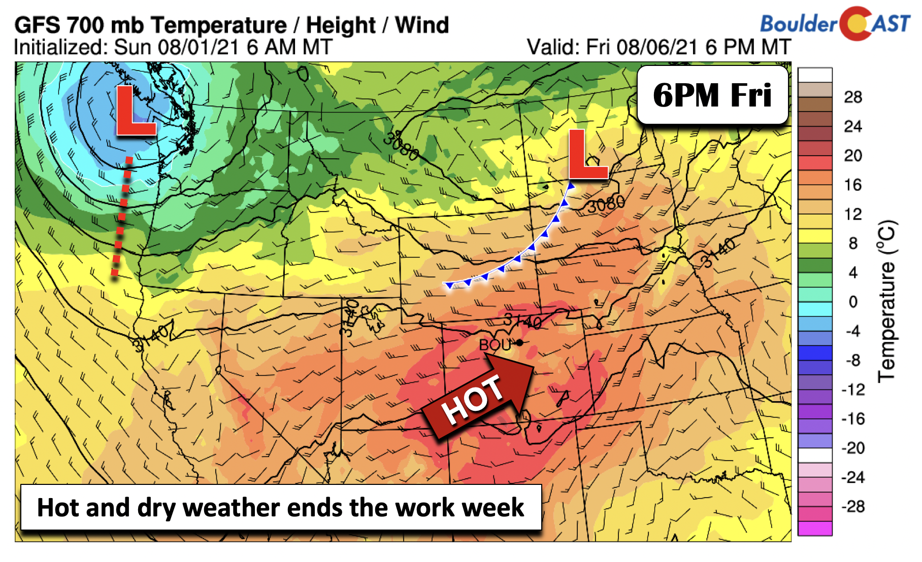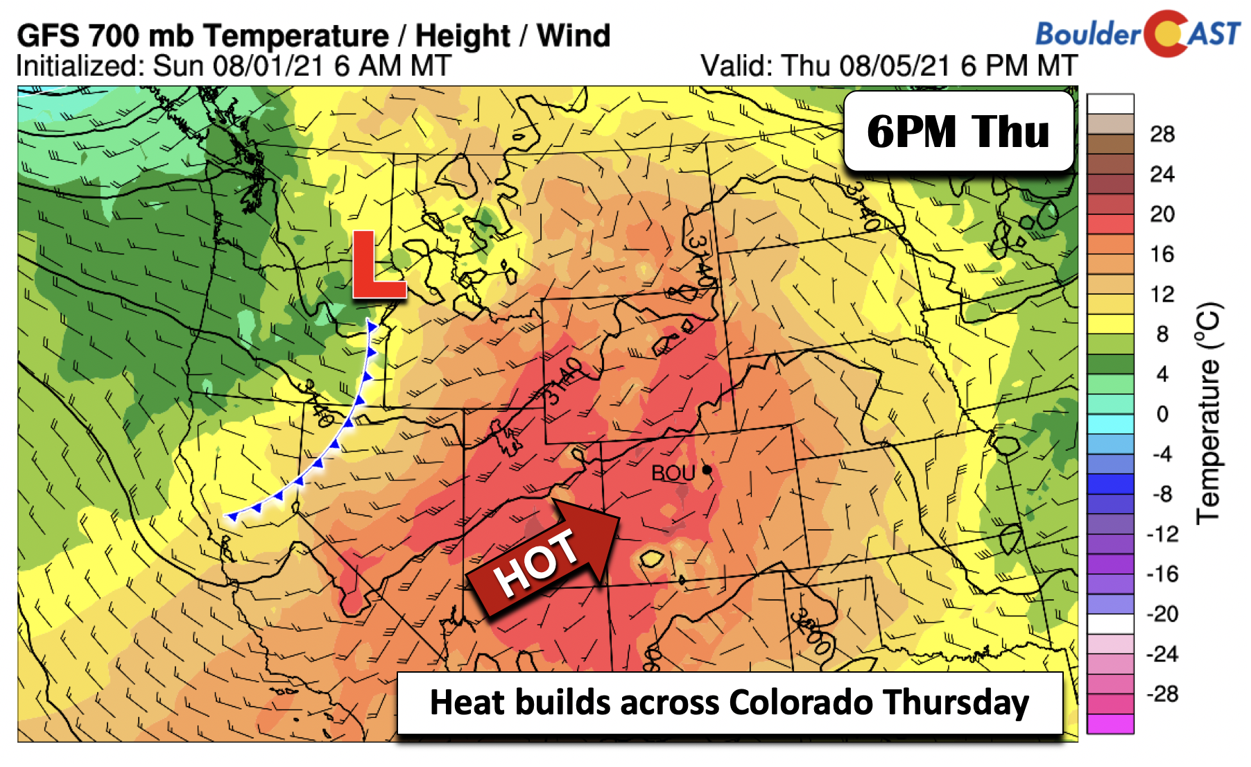 What will this mean for the Denver-Boulder area? Two words: hot and dry! Low-level temperatures on Thursday increase to around 18°C, enough to push highs for us back into the lower 90’s.