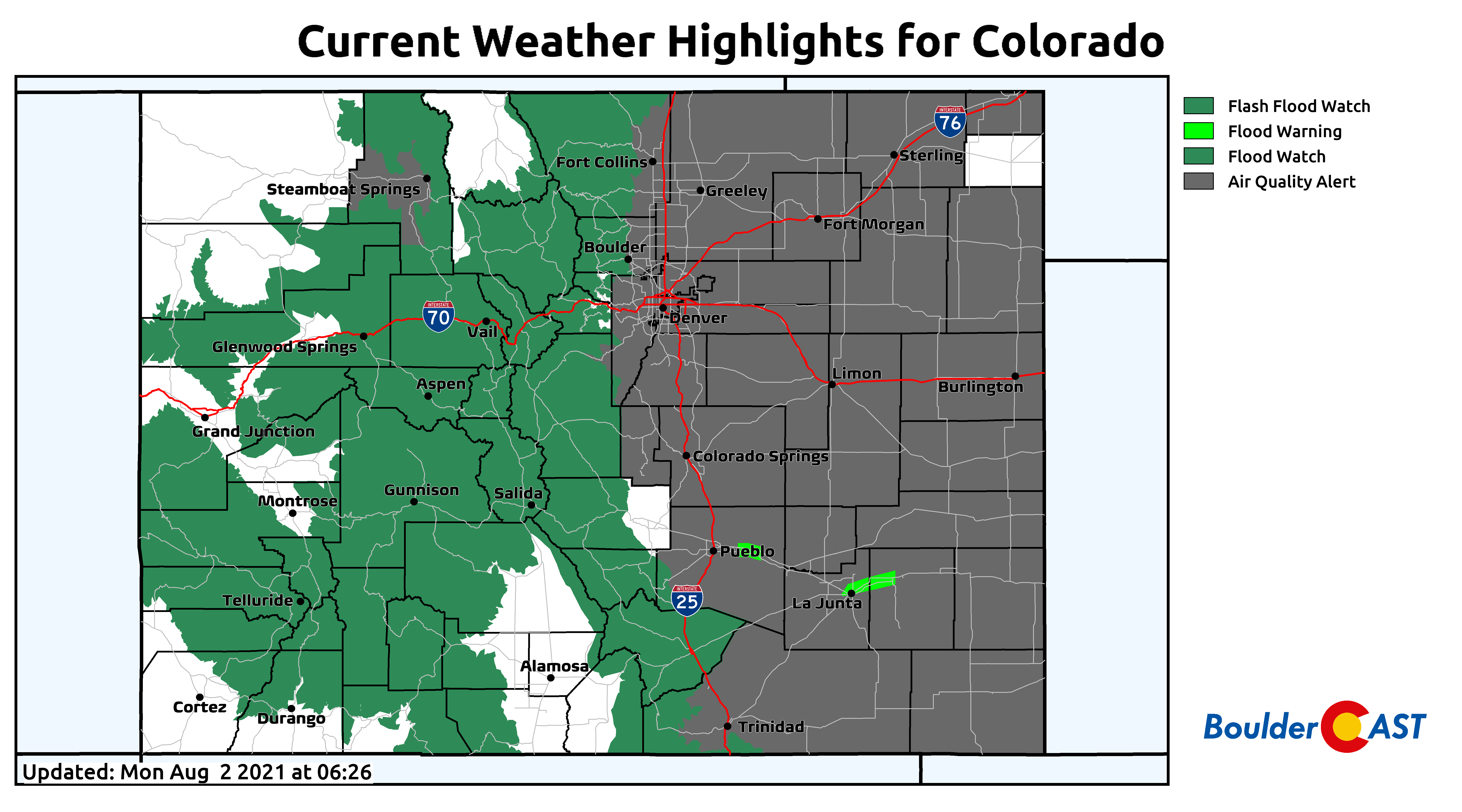 This week for the Front Range will feature thunderstorm chances early in the week followed by dry and hot weather for the latter portion. Flash flooding remains a concern through Tuesday, especially for the burn scars, as slow storm motions and monsoonal moisture team up. Very smoky conditions will persist through Wednesday, but some improvement in air quality should develop later in the week. Let’s take a look.