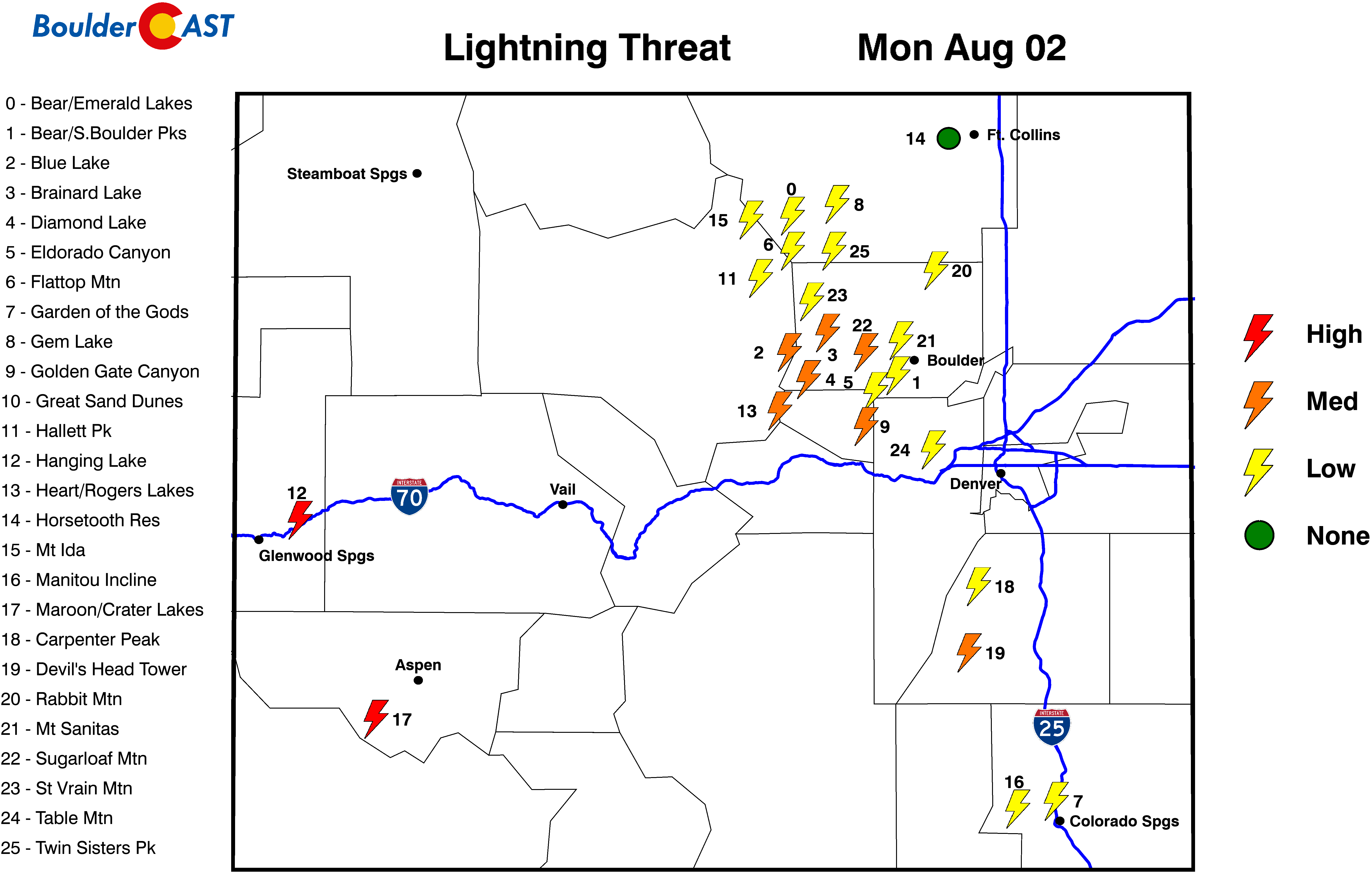 A Flash Flood Watch remains in effect for the Mountains and Foothills today. On the Plains, however, only a 10-20% chance of rain is forecast, given less than favorable conditions for the storms to survive their trek into the Denver Metro area. Highs Monday afternoon will hover near the middle 80’s, about average for early August.