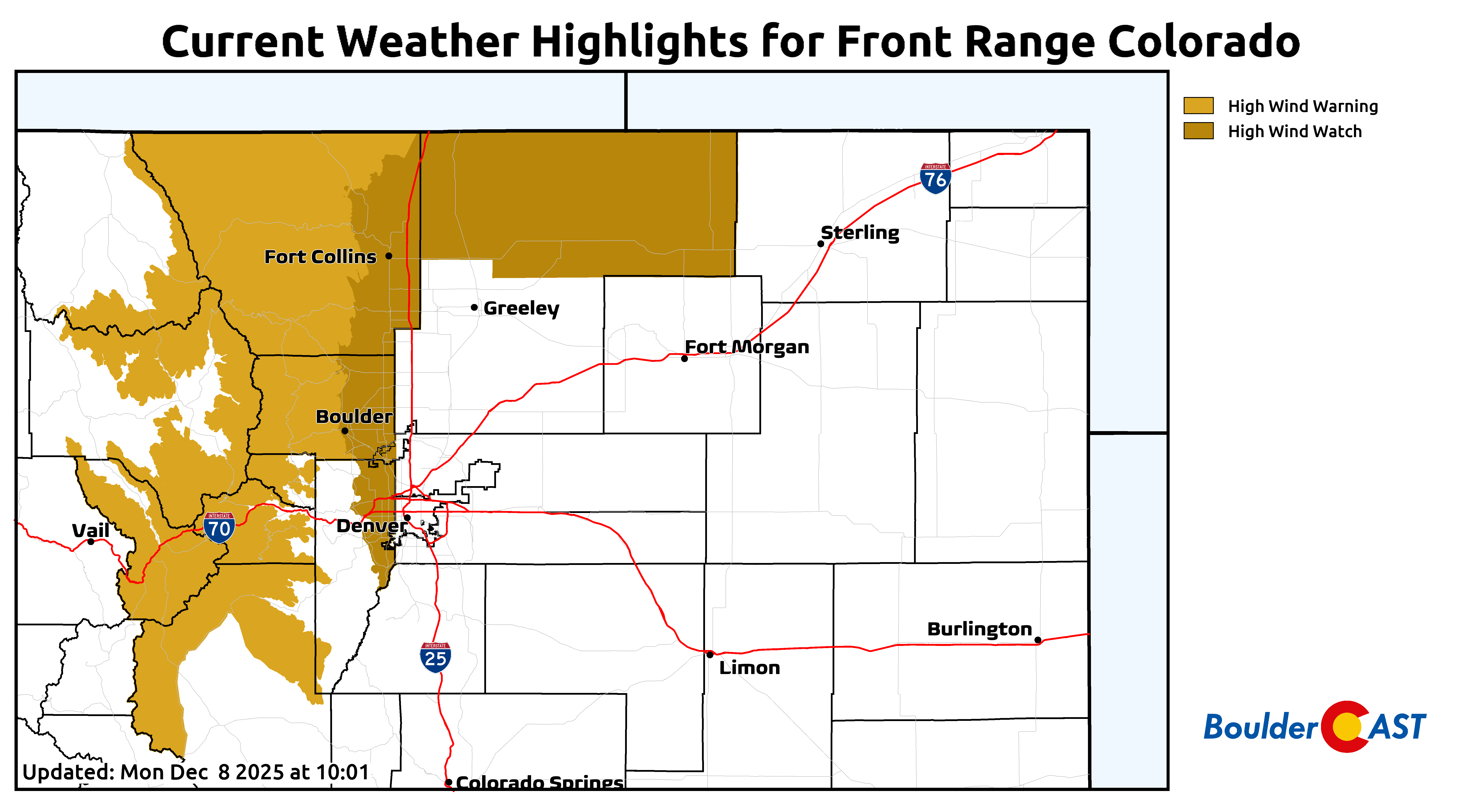 The Front Range finally saw its first real snow of the season last week, with Boulder picking up about 8 inches and the Foothills a bit more. The Mountains then cashed in over the weekend, stacking up one to four feet of powder. While this moisture is a welcome boost to our lagging snowpack, it’s not enough to erase drought concerns—but fire risk this year looks very different than the setup before the Marshall Fire. Looking ahead, the story shifts from snow to wind: multiple high‑wind events are on tap for the Foothills this week, while Boulder and Denver stay mostly dry and mild with highs in the 50s to 60s with occasional breeziness. Read on for the full breakdown of this week’s weather.