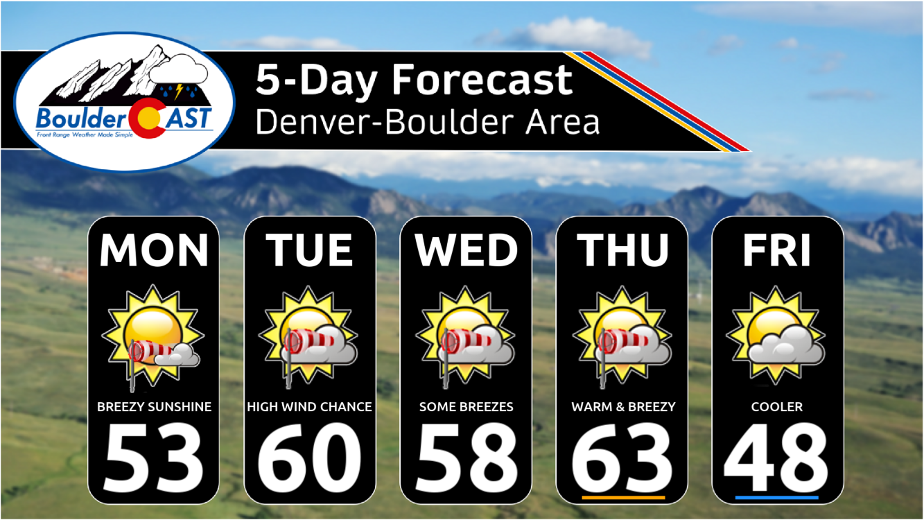 First up, though, is Monday which will be a beautiful day in the Front Range. Boulder and Denver should reach the lower 50s with mostly sunny skies and generally light winds, though with intermittent breeziness in spots.
