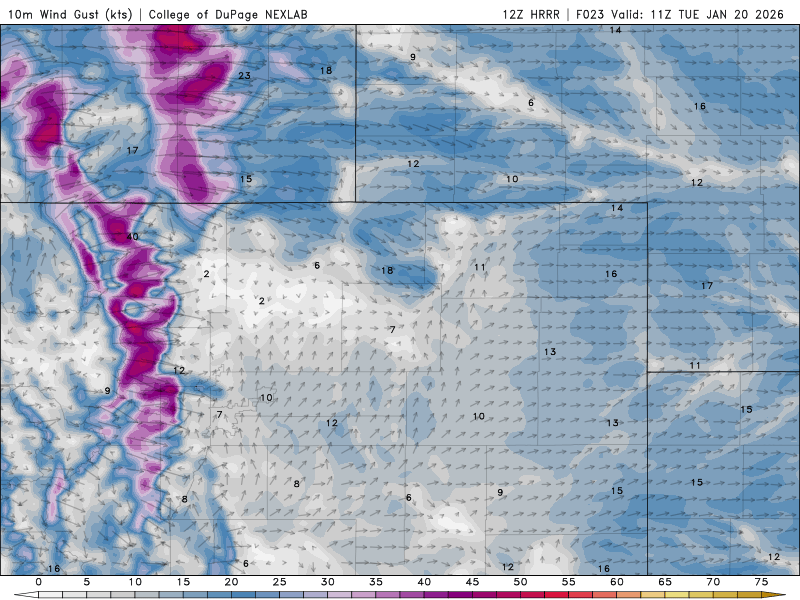 Tuesday: Gusty, warmer, and dry, with an elevated fire danger threat. Highs in the low 50s on the Plains and low 40s in the Foothills, with WNW winds gusting up to 30 MPH on the lower elevations and up to 60 MPH in the Foothills.