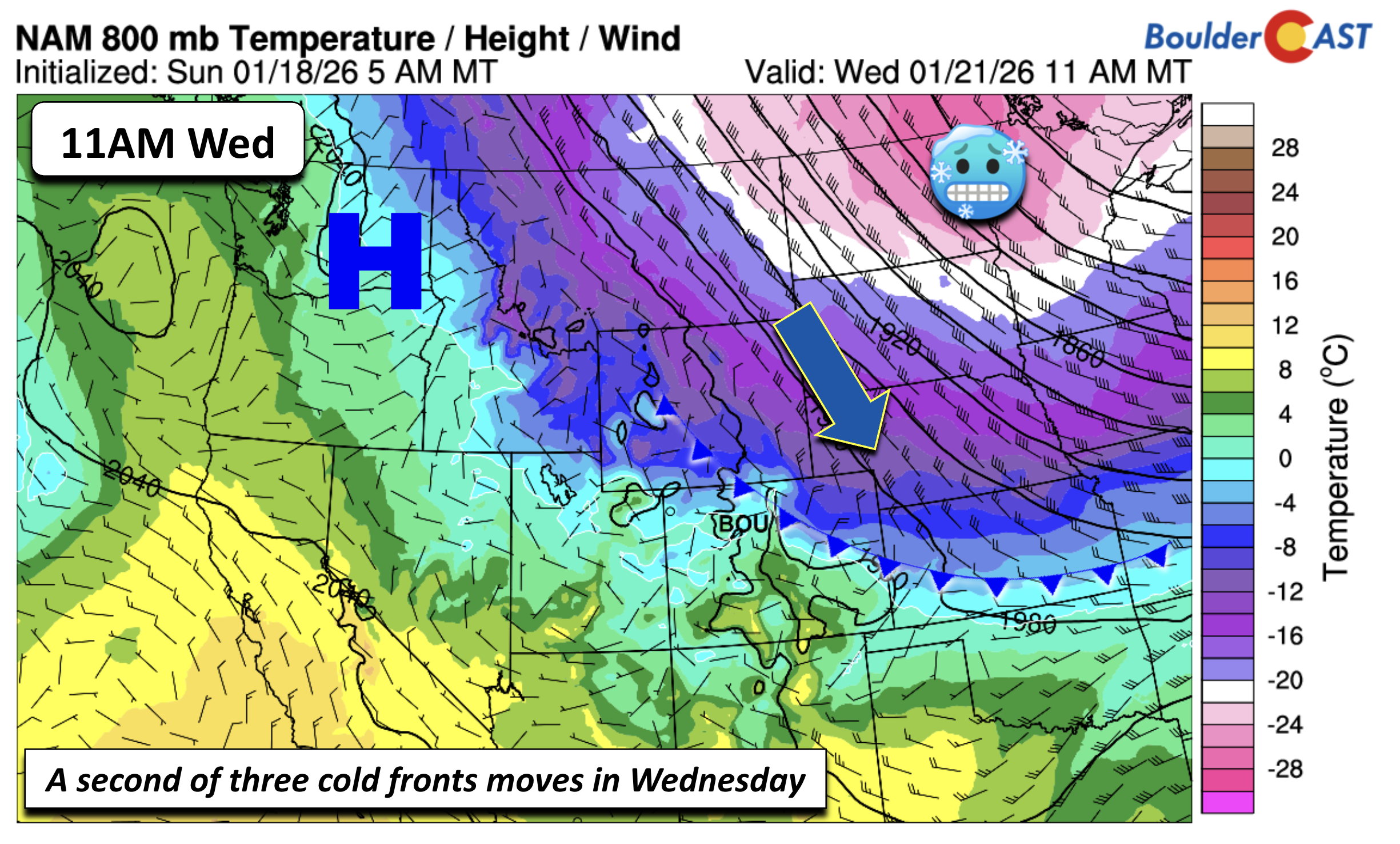 The Arctic air is expected to surge all the way into the Southern Plains by midday Friday, with the coldest core centered over the Upper Mississippi Valley. For Boulder and Denver, teens aren’t off the table if the cold air undercuts the Rockies more aggressively than shown.
