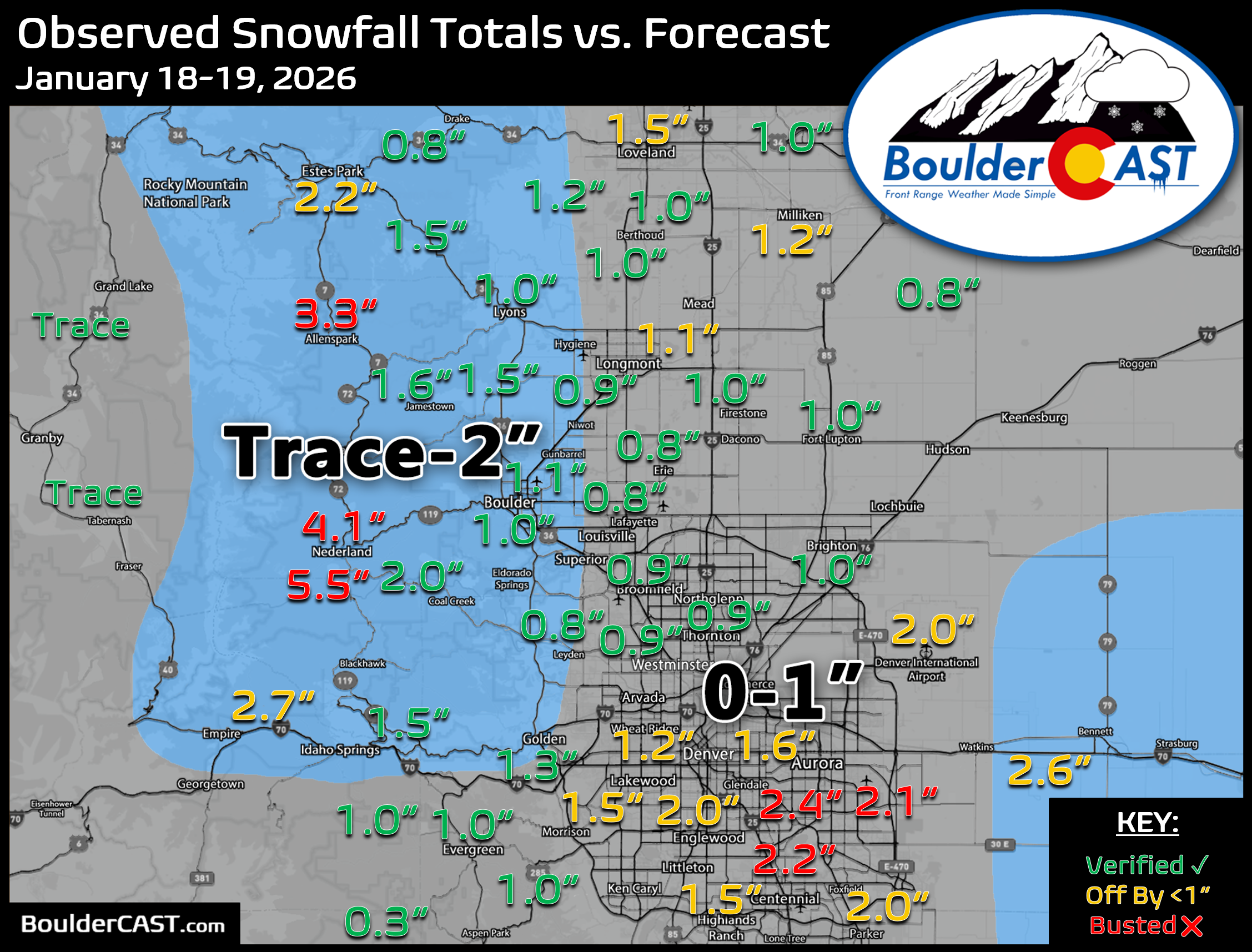 Sunday night’s light snow is already packing its bags and heading out, with flurries tapering off around sunrise. Snow totals of 1 to 2 inches were common overnight, with surprising totals over 3 inches in parts of the high Foothills.