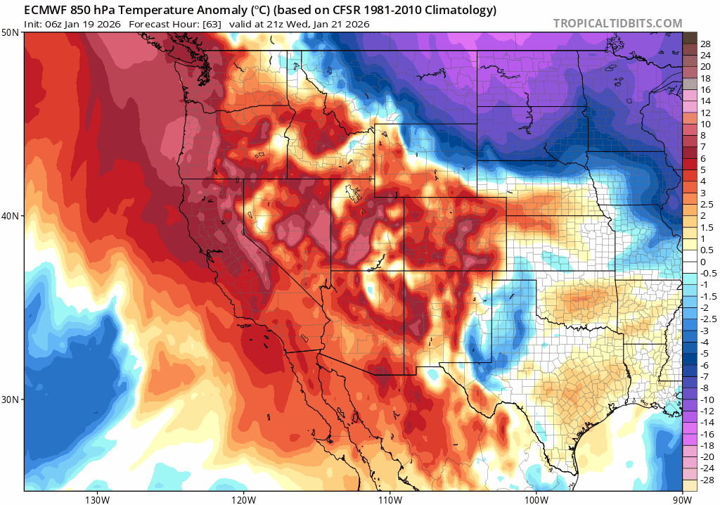 850mb temperature anomaly forecast from the Euro model for the late week period showing Arctic air spilling into eastern Colorado
