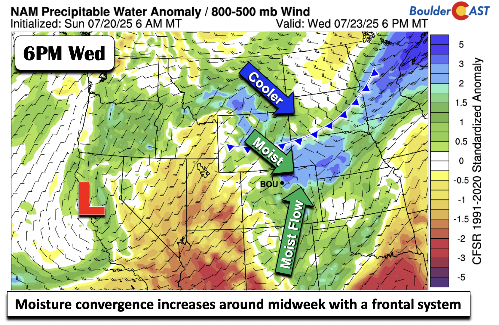 After a hot and mostly dry Monday, the Front Range is in store for a wetter stretch midweek, with an uptick in monsoonal moisture and storm activity. A favorable upper-air pattern and midweek cold front will drive daily thunderstorm chances and potential flash flooding, especially Tuesday through Thursday. Conditions will trend hotter and drier into the weekend and next week, exacerbating the ongoing drought and fire risk in the High Country.