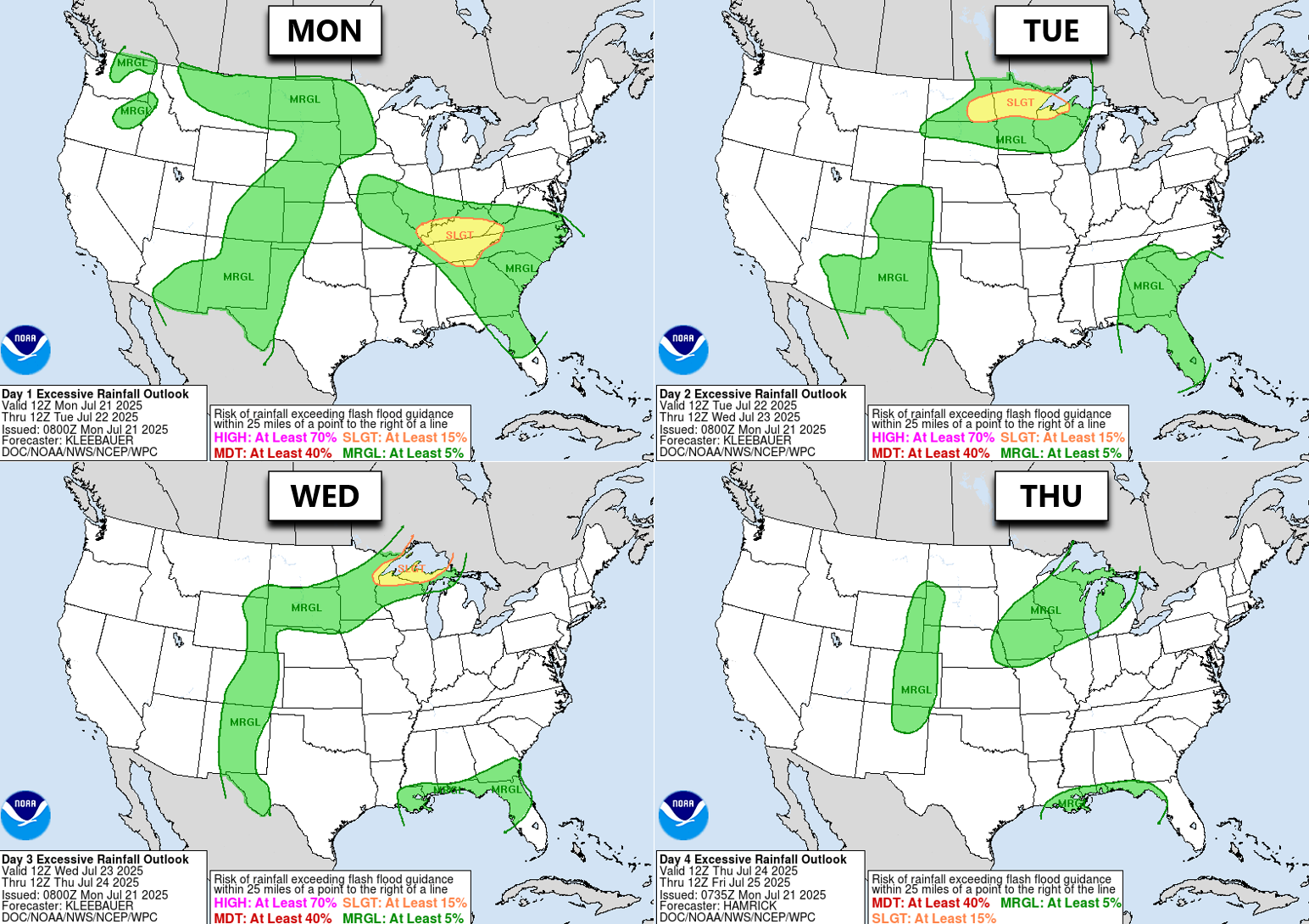 The NOAA Weather Prediction Center currently places much of the Front Range under a Marginal Risk for excessive rainfall nearly every day this week.