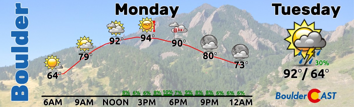 Monday: Partly cloudy with isolated late-day storms coming off the terrain — more wind than rain with these. Highs hot in the low to middle 90s for the Plains with lower 80s in the Foothills.