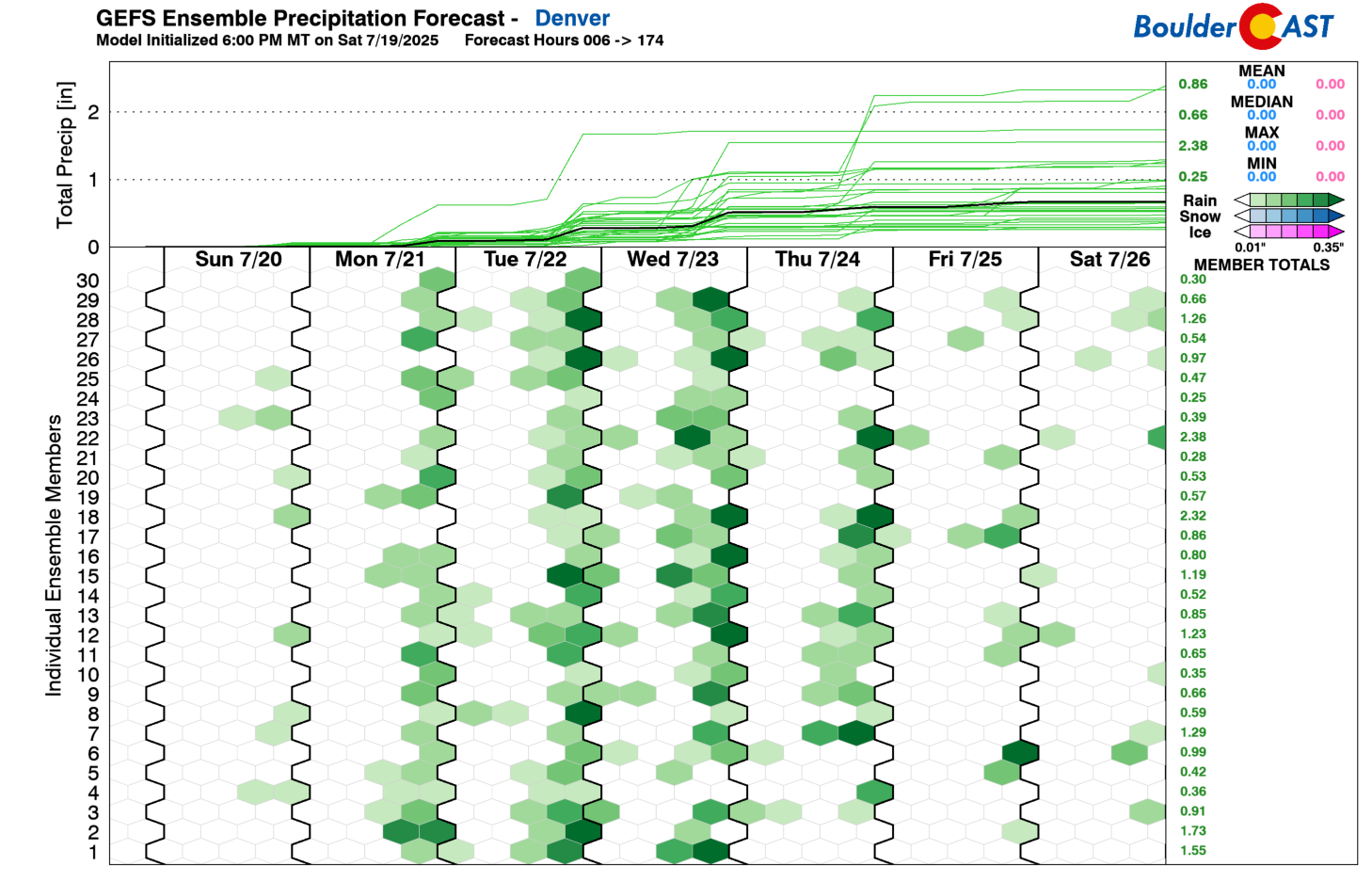 Anoticeable uptick in monsoonal moisture is on the way—especially from Tuesday through Thursday. That’s our prime window for widespread storm activity, with almost daily chances for showers and thunderstorms centered on the midweek stretch. We’ll dig into the broader weather pattern driving these changes, but heads up: heavy rainfall and localized flash flooding are on the table throughout the week. Some ensemble members from the GEFS are even showing QPF totals over 2 inches. While those are on the high end, they do underscore the risk of excessive rainfall.