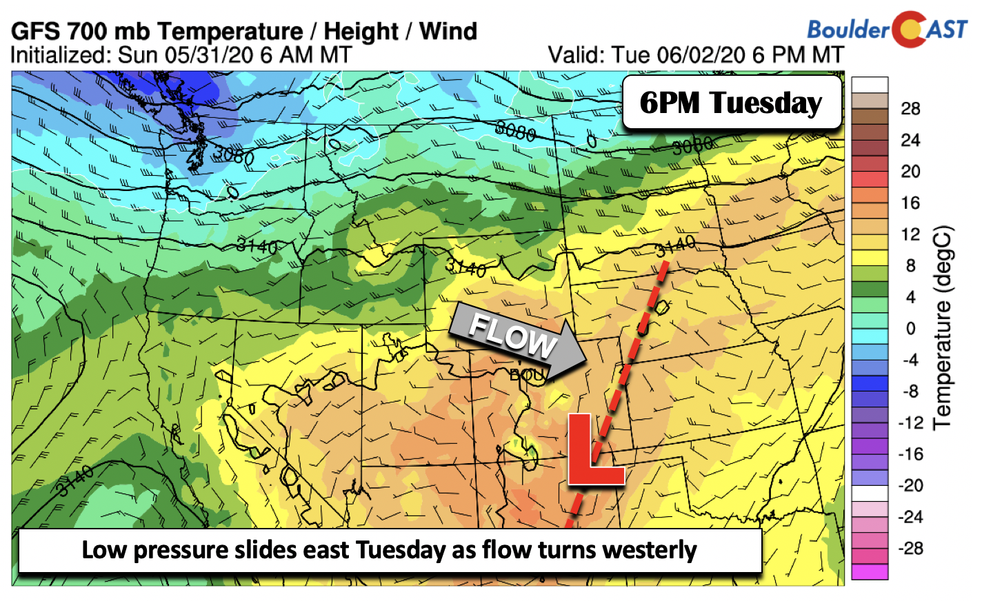 The week starts out similar to where we left off on Sunday…the last day of May. The airmass is virtually unchanged albeit a tad warmer in the low-levels. These next few days, we are watching a weak circulation of low pressure over southern Colorado (below). The position of the system today will favor weak upslope flow both aloft and at the surface. This system, along-side the warm and moistened airmass, will support that continued 20% or so chance of storms this afternoon into evening. Morning sunshine will give way to increasing clouds.