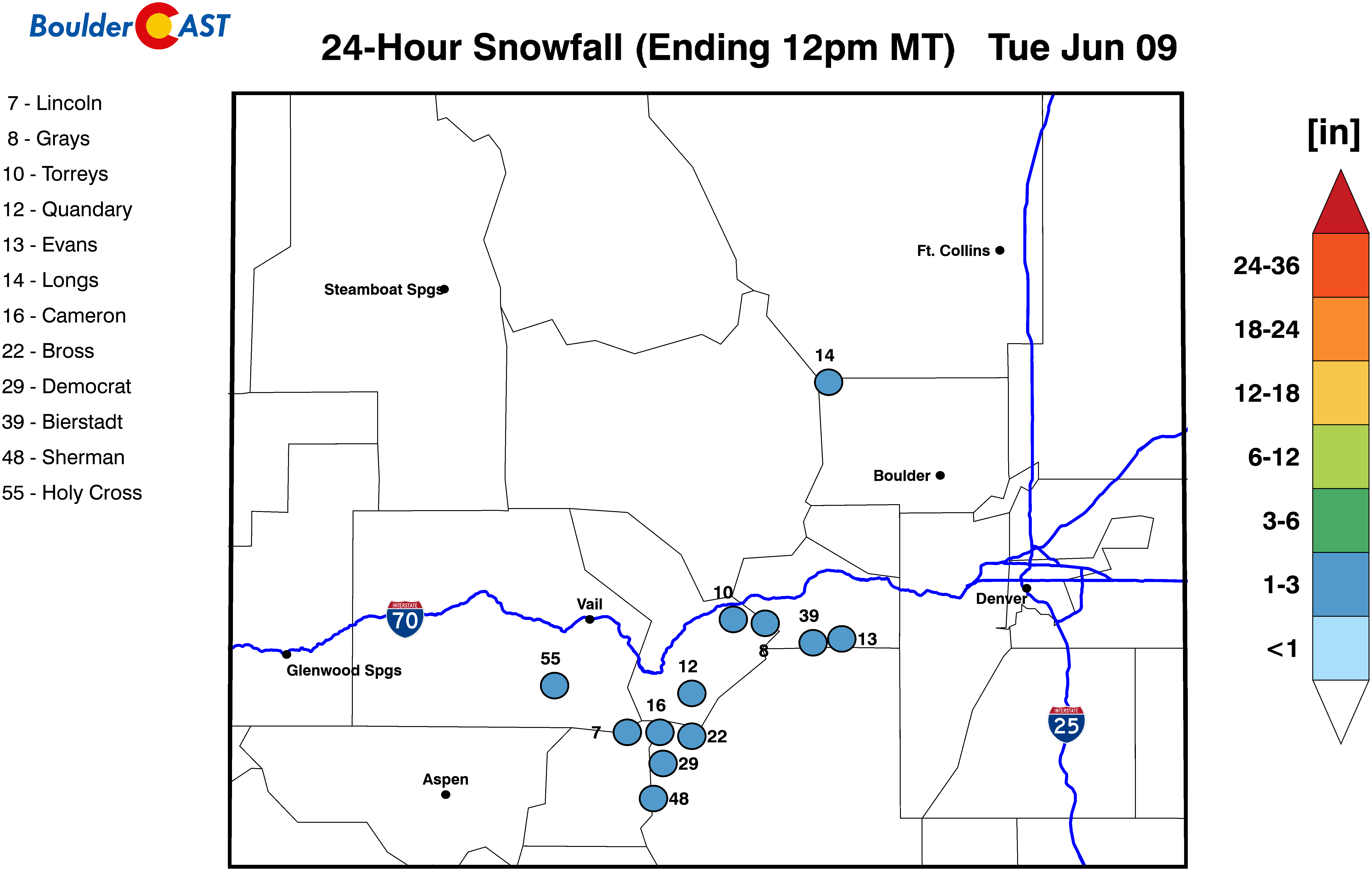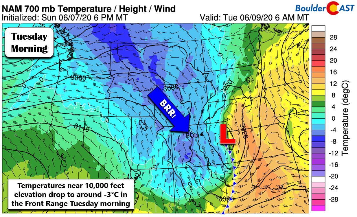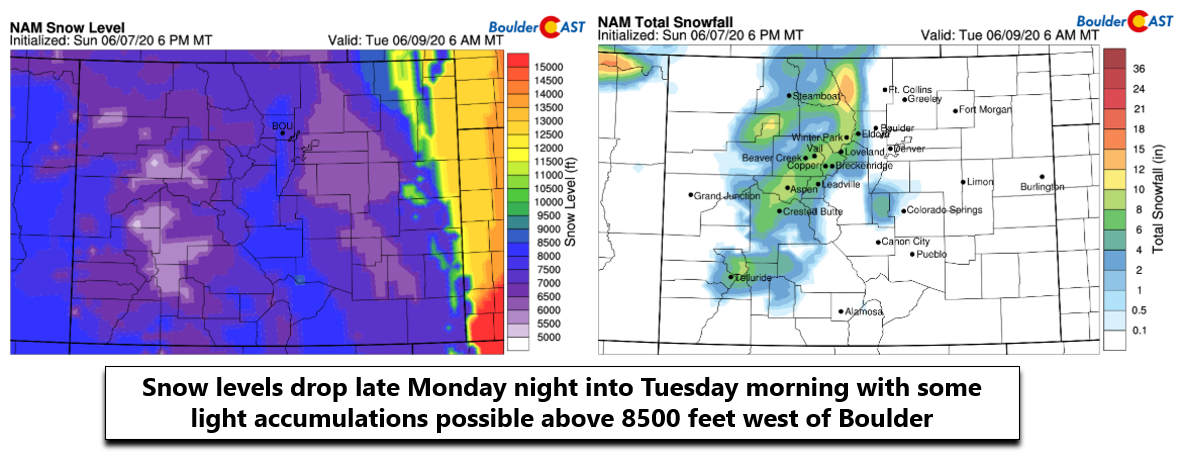 We’ll also be watching temperatures late Monday night for snow levels to come down as the cold core of the trough axis moves across the area. The overnight timing and chilly temperatures will produce several inches of accumulation above timberline (3-7″). With snow levels expected to drop to around 8000 feet or slightly lower by early Tuesday morning, the highest Foothills west of Boulder along Peak to Peak highway could see a dusting up to 2″ of June snow. The same can be said for the highest points in the Palmer Divide. If you’re traveling over any of the mountain passes late Monday night, do expect a late-season taste of winter weather on your journey.