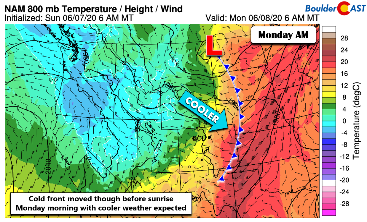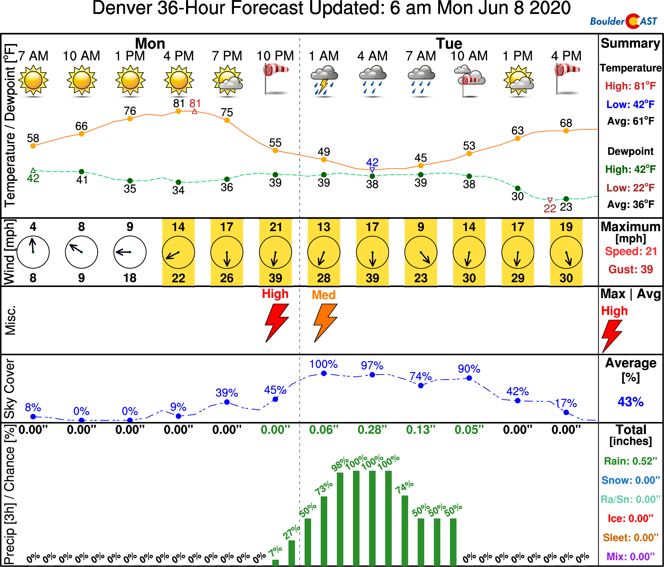 Monday: Mostly sunny and dry through the day. A cold front will plow through by evening from the northwest with strong winds gusting from 35 to 65 MPH across the area. Winds will be strongest east of Interstate 25. Widespread rain develops overnight and lingers into Tuesday morning. Some thunder is also possible. Temperatures will be cold enough overnight for snow or rain/snow in the higher Foothills with very light accumulations possible. Highs near 80 degrees on the Plains with upper 60’s in the Foothills.