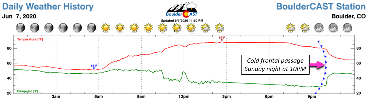 The initial cold front passed through the Front Range during the overnight hours. It was definitely quite warm last night when I was trying to fall asleep, but it did cool off nicely by sunrise. A timeline of temperature and dew point observations from BoulderCAST Station shows the front moved through around 10PM Sunday evening.