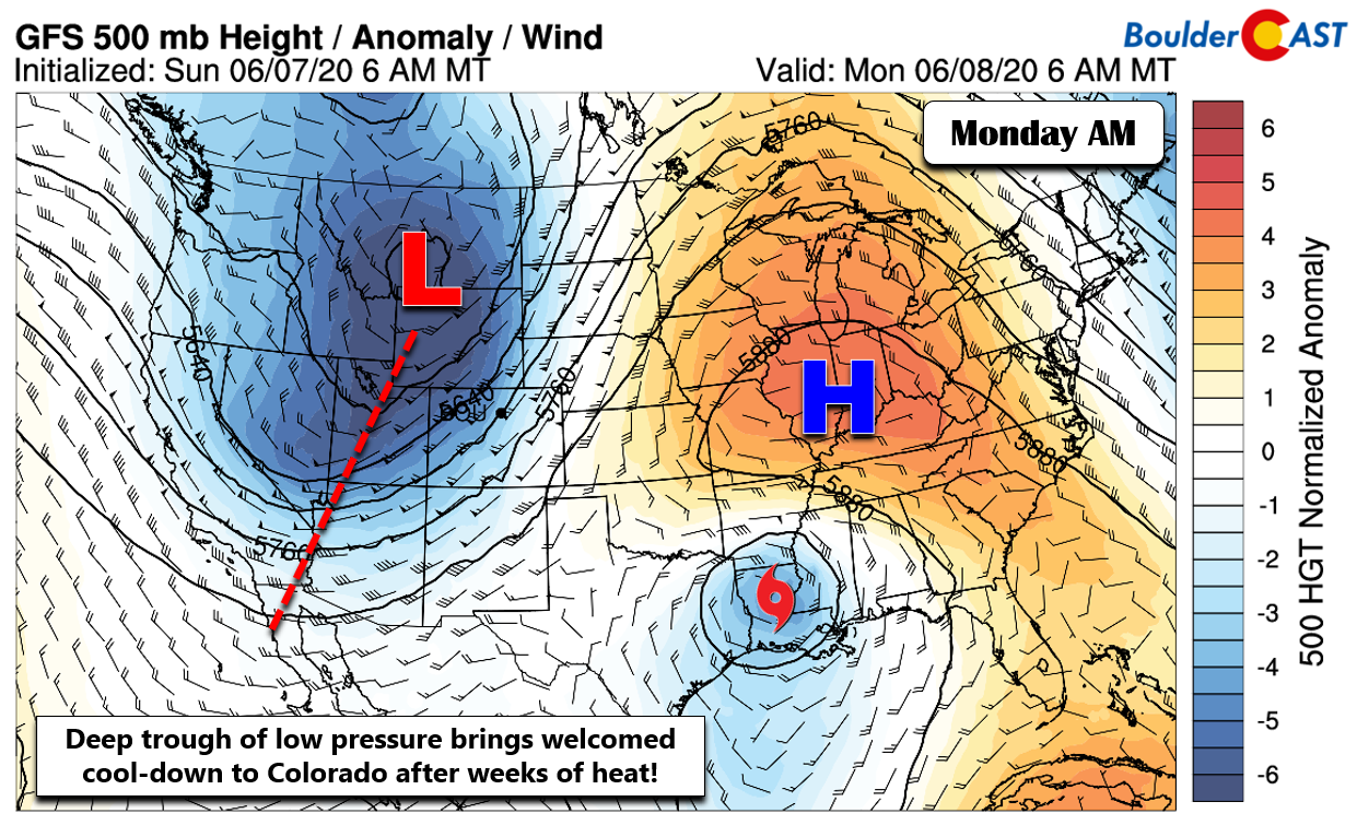 A welcomed cool-down will transpire early in the week as a strong Pacific trough moves across the Rockies. However, accompanying the cooler temperatures will be very strong winds Monday evening and night, as well as widespread rain and even some wet snow in the higher elevations. By mid-week, yet another ridge of high pressure will begin to take shape leading to a warming and drying trend for the Front Range.