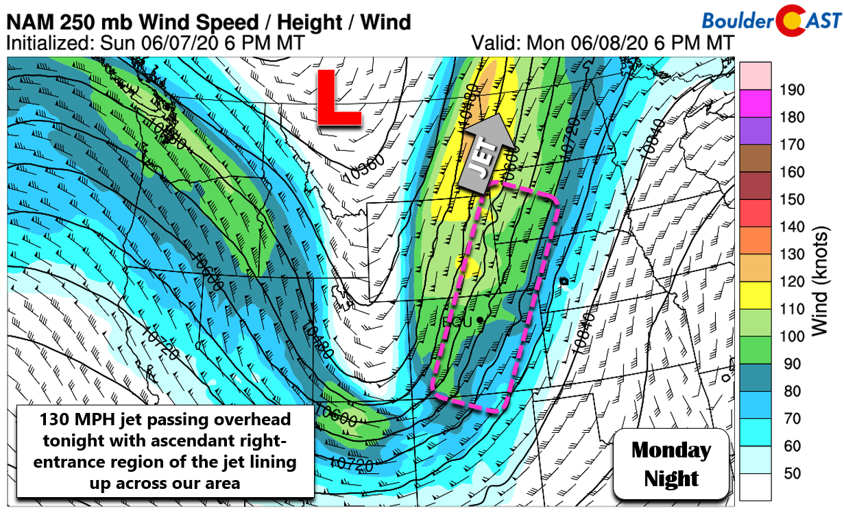The net result will be a favorable period for rain across the Boulder and Denver area from the late evening into the overnight Monday night. A vast majority of model solutions have the rain holding off until after 10PM, so it really will be a mostly overnight event. However, with the jet approaching, it wouldn’t be surprising to see a few storms fire a little earlier, especially further north in the higher terrain near the Wyoming border. In any case, the overnight period into early Tuesday will offer a good chance of rainfall region-wide.