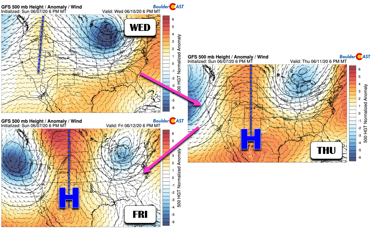 Yet another significant ridge of high pressure begins to reform across the spine of the Rockies late in the week. This is seen in both the GFS and European models. This will spell out generally dry conditions with temperatures starting to heat back up into the 80’s and eventually the 90’s. This “ridgy” pattern takes on the shape of an omega block later this week, so it ultimately could be a rather stagnant set-up that keeps us very warm for an extended period. While the upcoming weekend looks warm to borderline hot, there should at least be a chance of storms each day with the flow of moisture from the southwest beginning to increase as the ridge axis passes to our east.