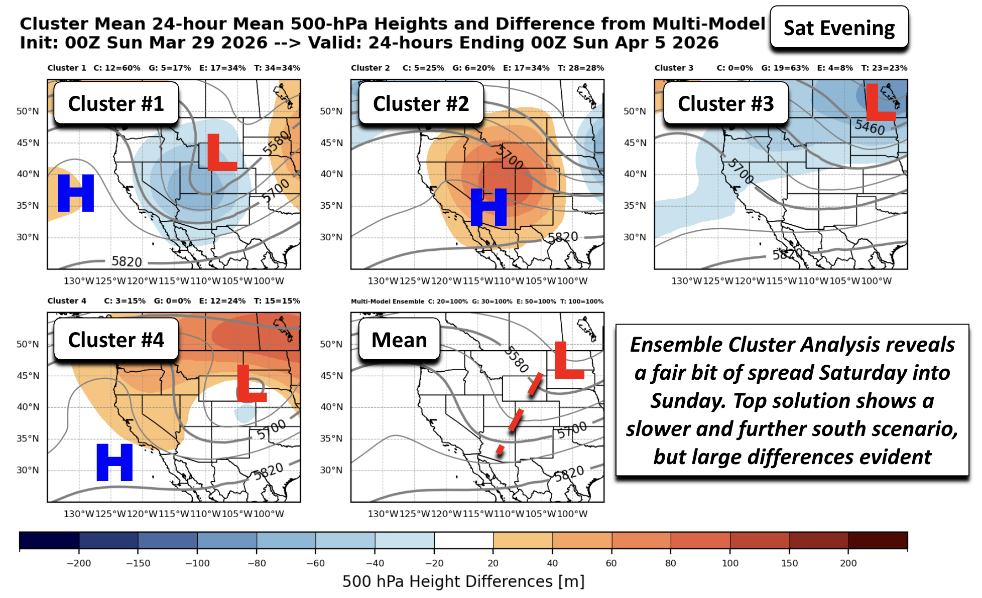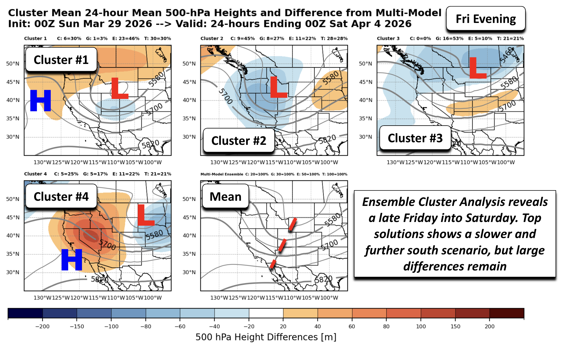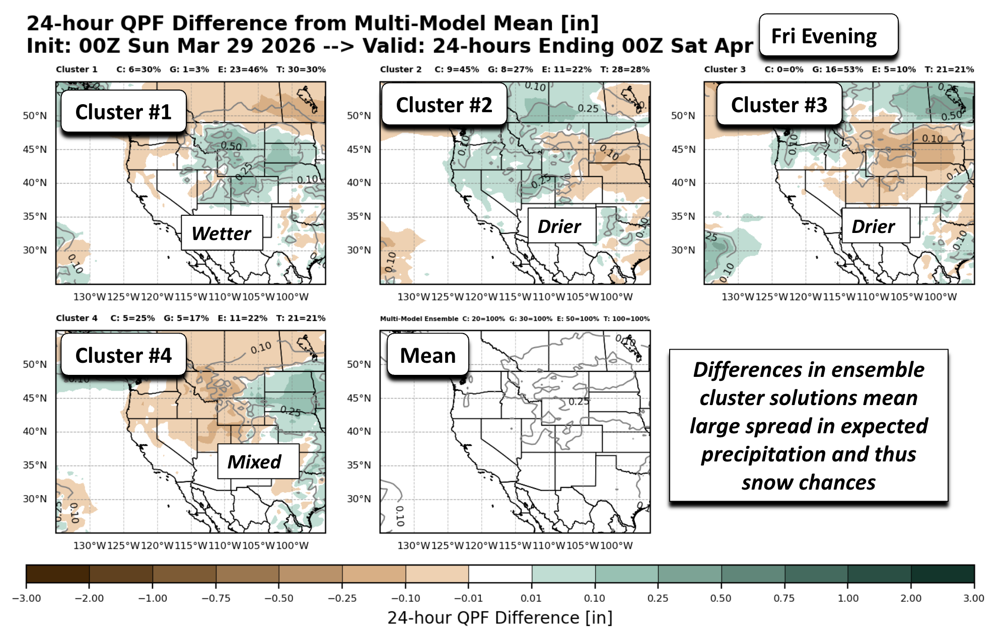 A more in-depth analysis reveals a fair bit of uncertainty between a dry or snow/rain forecast during the late-week and weekend. To illustrate this, let’s review the ensemble cluster solutions, allowing us to see where the most-skilled mid-range forecasts may be trending. Below shows a cluster analysis for a 100-member ensemble of the GEFS, GEPS, and EPS ensemble systems combined. Each cluster solution shows a possible scenario in 500-mb heights for the trough/ridge pattern. The shading indicates how each solution differs (positive = orange; negative = blue) from the mean 500-mb height field. The mean pattern shows a trough extending west of Colorado Friday evening, with its mean center over Wyoming, similar to the GFS. But the first cluster, representing 30% of ensemble solutions, is further west and deeper with the trough. Cluster #2 is also deeper and slower. The #3 and #4 clusters are further north and faster with the trough.