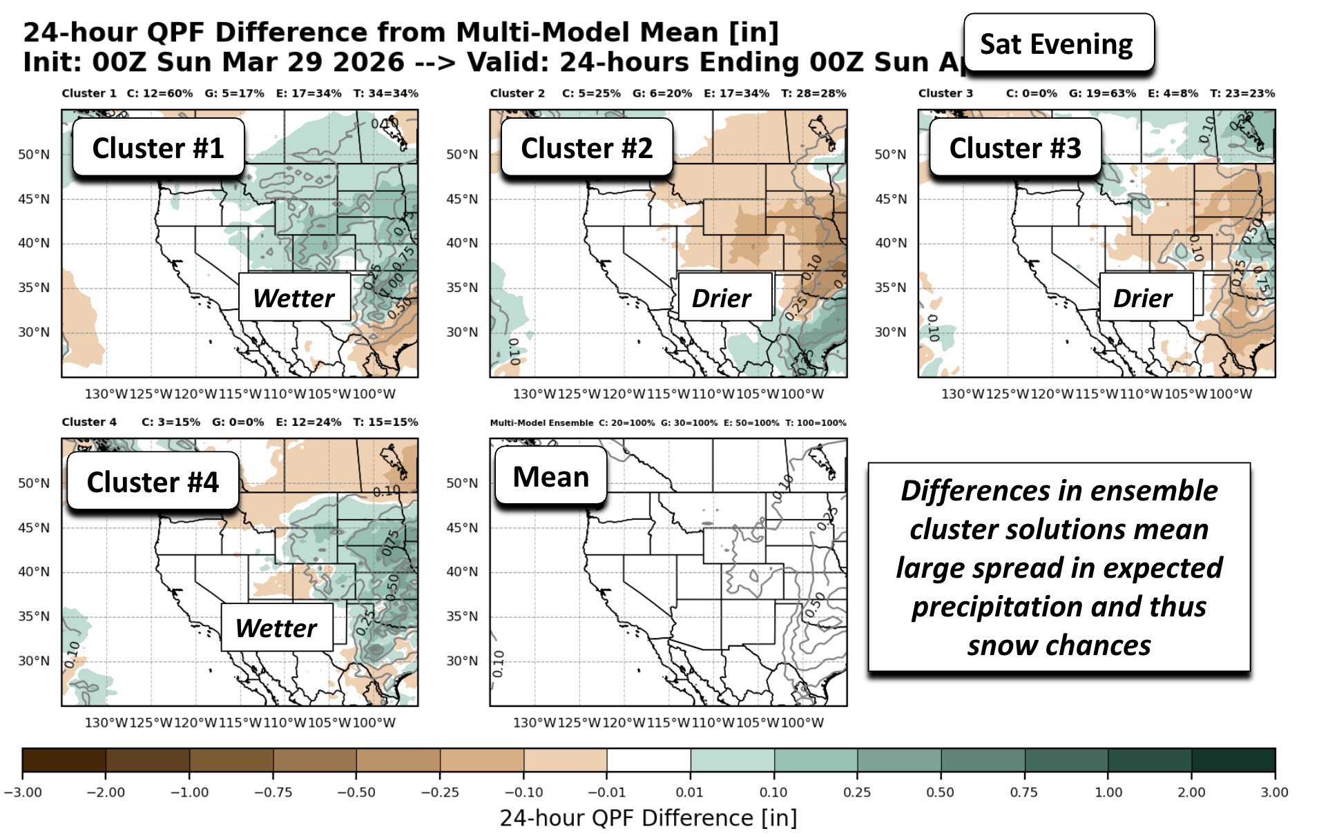 Similarly, we can look at the precipitation differences on Saturday. The further south and slower solutions (clusters #1 and #4), representing about 45% of the possible ensemble members, are wetter and favor a higher snow chance. But clusters #2 and #3 are notably drier with the northern track and ridging building in with the faster exit.