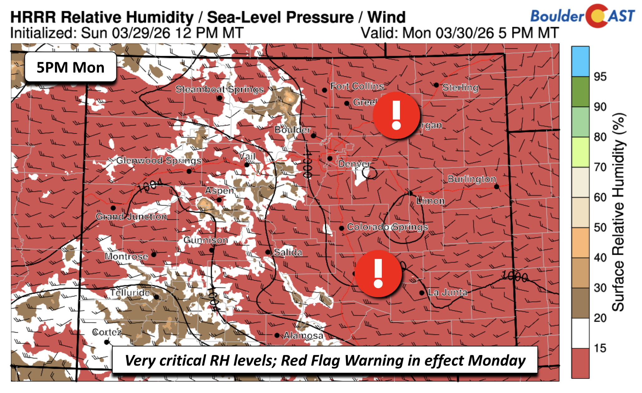 - 🔥 Fire danger Monday: Downslope warmth, RH <15%, and gusts to 20–30 MPH prompted a Red Flag Warning for Boulder, Fort Collins, and the Foothills as temperatures head toward record territory.
