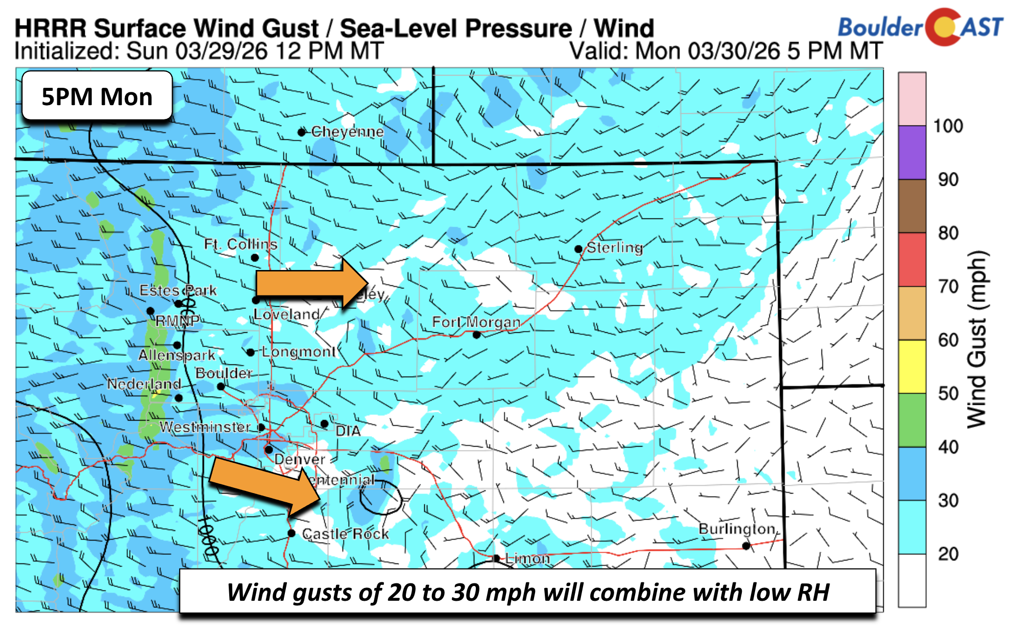 Monday: Record warmth, gusty winds, and very dry with Red Flag conditions. Highs near 80 for the Plains and 70 in the Foothills.